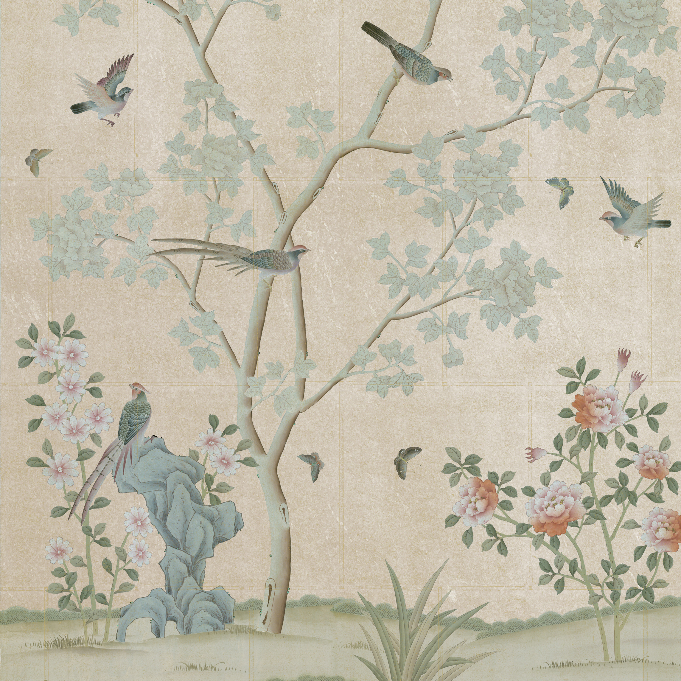 Hand painted flowering trees and shrubs with ancient artefacts and delicate painted jardinières are portrayed in our design Alperton. Birds and butterflies decorate this beautiful chinoiserie scene.