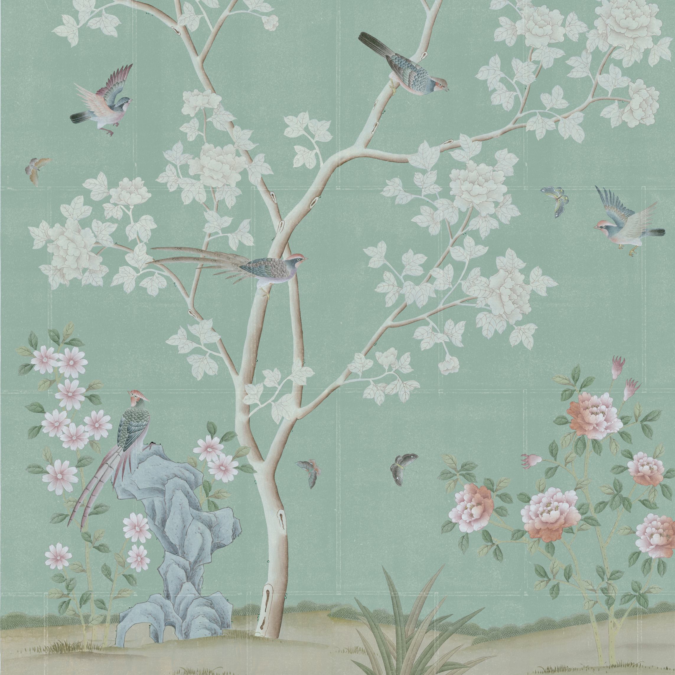 Hand painted flowering trees and shrubs with ancient artefacts and delicate painted jardinières are portrayed in our design Alperton. Birds and butterflies decorate this beautiful chinoiserie scene.