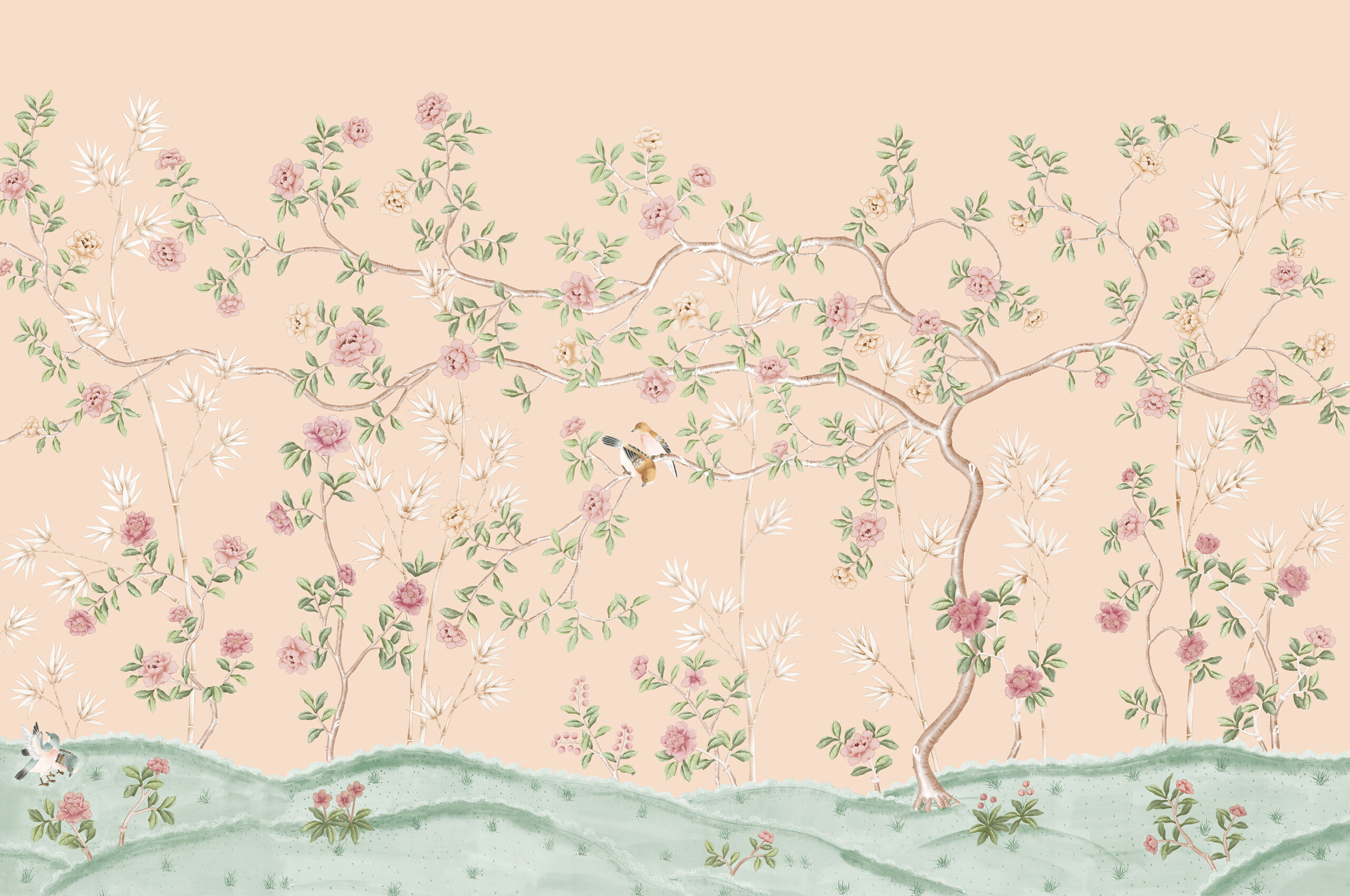 Delightful floral scene depicting a flowering tree with outstretched branches set against a faint backdrop of traditional bamboo. Historically, birds and flowers are the most popular motifs in the decorative art of chinoiserie, and here birds move gracefully within this whimsical scene. The design looks particularly beautiful when printed on silk or gilded metallic with a light or dark background colour.