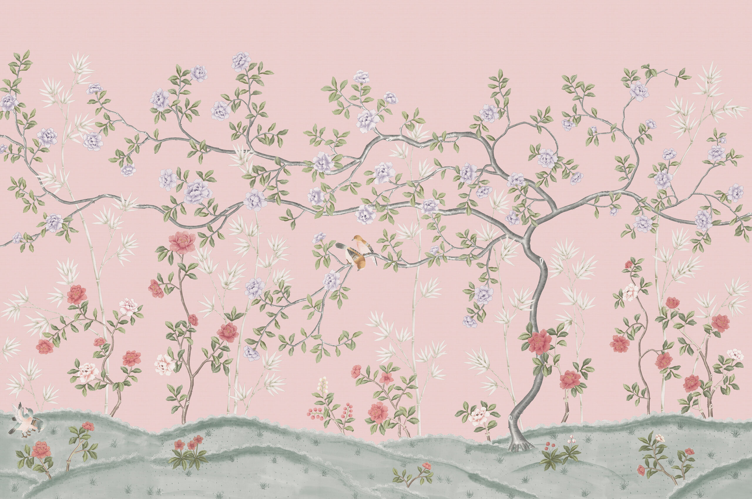 Delightful floral scene depicting a flowering tree with outstretched branches set against a faint backdrop of traditional bamboo. Historically, birds and flowers are the most popular motifs in the decorative art of chinoiserie, and here birds move gracefully within this whimsical scene. The design looks particularly beautiful when printed on silk or gilded metallic with a light or dark background colour.