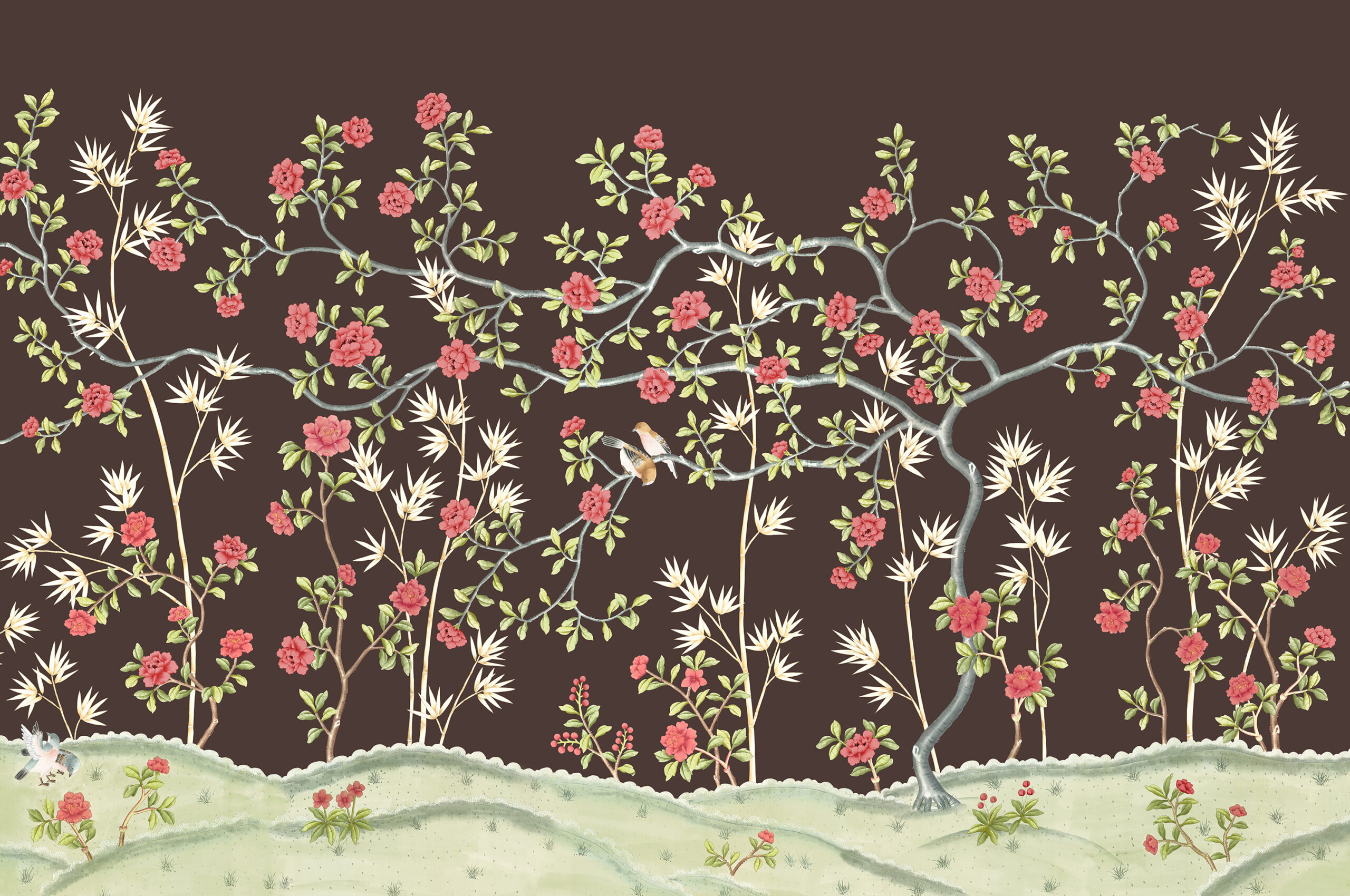 Delightful floral scene depicting a flowering tree with outstretched branches set against a faint backdrop of traditional bamboo. Historically, birds and flowers are the most popular motifs in the decorative art of chinoiserie, and here birds move gracefully within this whimsical scene. The design looks particularly beautiful when printed on silk or gilded metallic with a light or dark background colour.