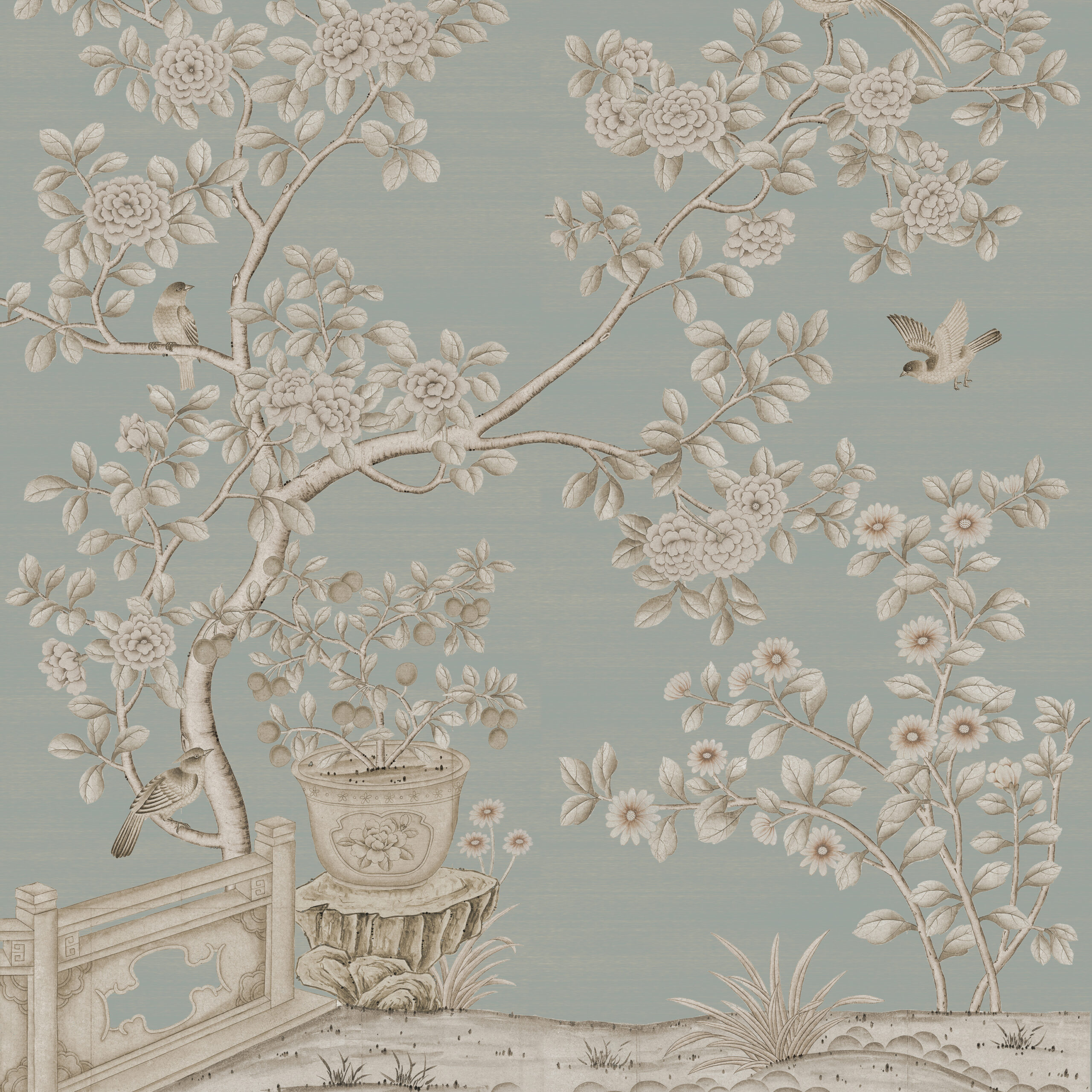 Our stunning representation of an elaborate azalea garden in full bloom featuring a low-level traditional wall marking a pathway through the garden. Long tailed birds and butterflies are delicately hand painted around the azalea trees.