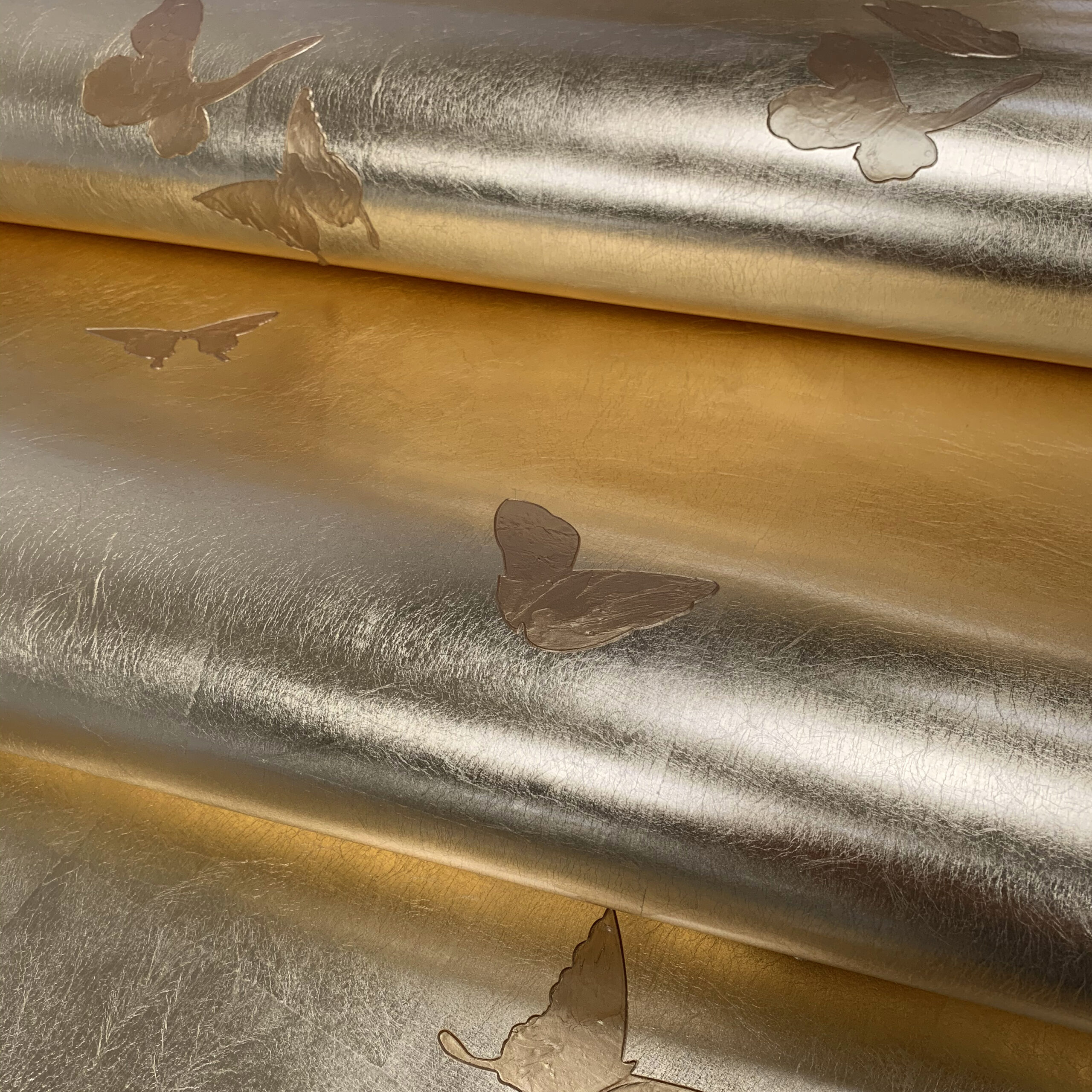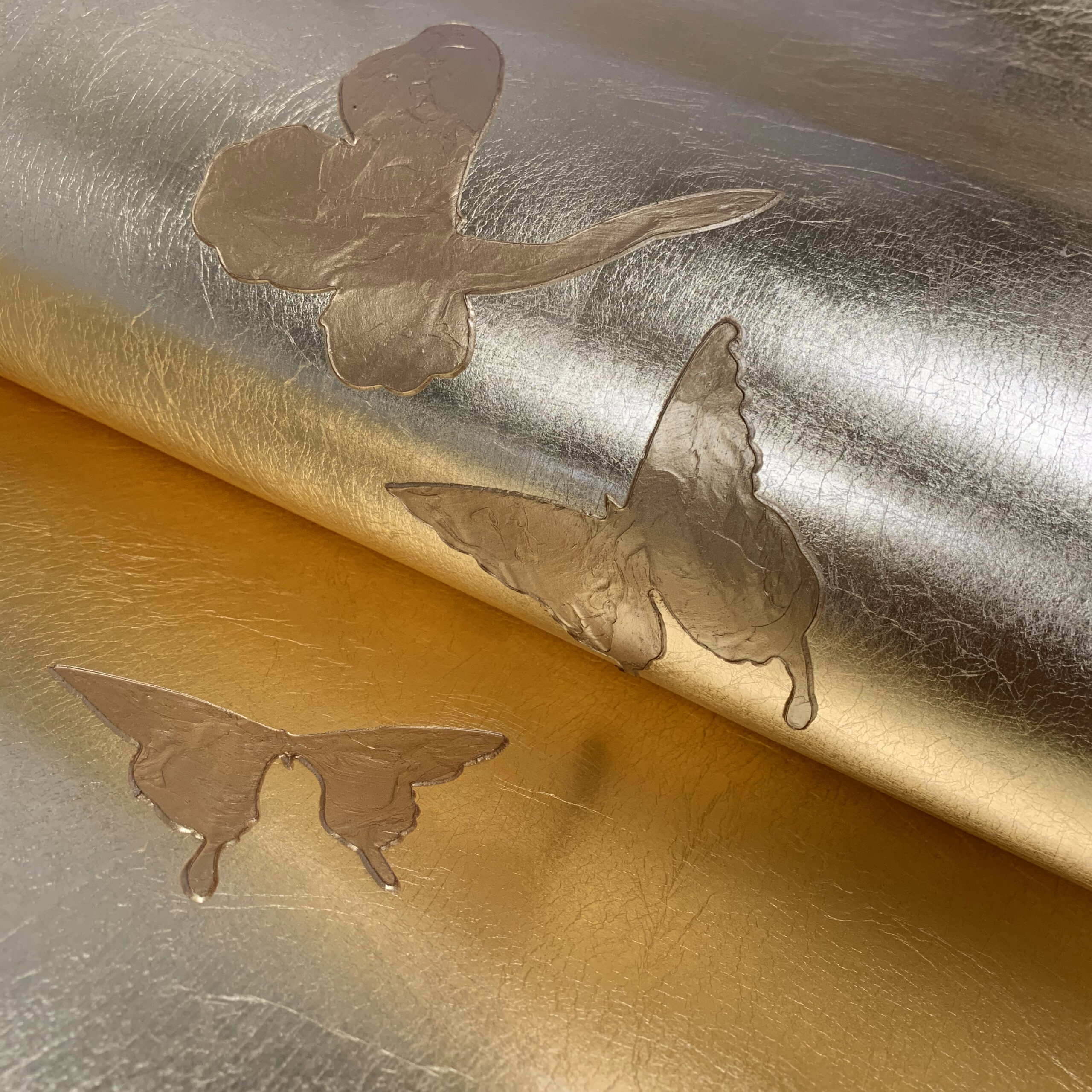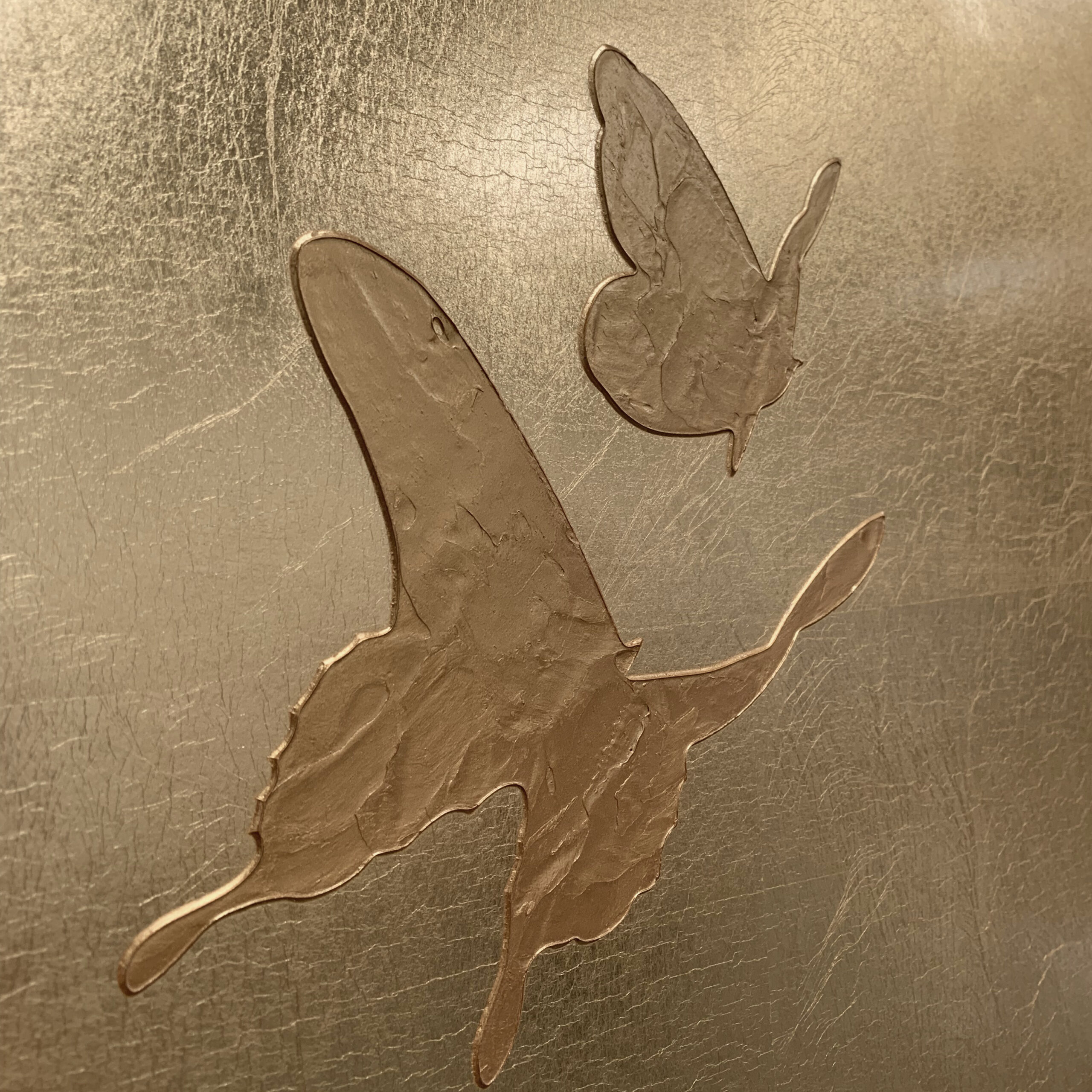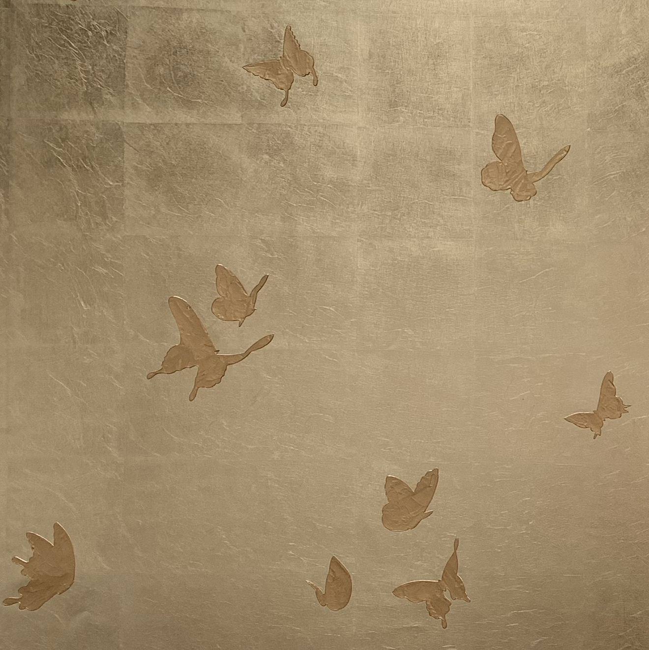The beautiful butterfly is created by applying gold metallic paste by hand with a palette knife to either grasscloth or hand gilded metallic. The gold butterfly applied to a metallic gold ground creates an intense luxurious multidimensional look. Applied to grasscloth contrast is created between the natural matt grasscloth ground and the delightful gold butterfly. Our pearlised butterflies applied to hand gilded metallic grounds create a more subtle effect that can be intensified with the addition of colour to the metallic wall covering. Whichever butterfly or ground you choose the design will add impact to any scheme.