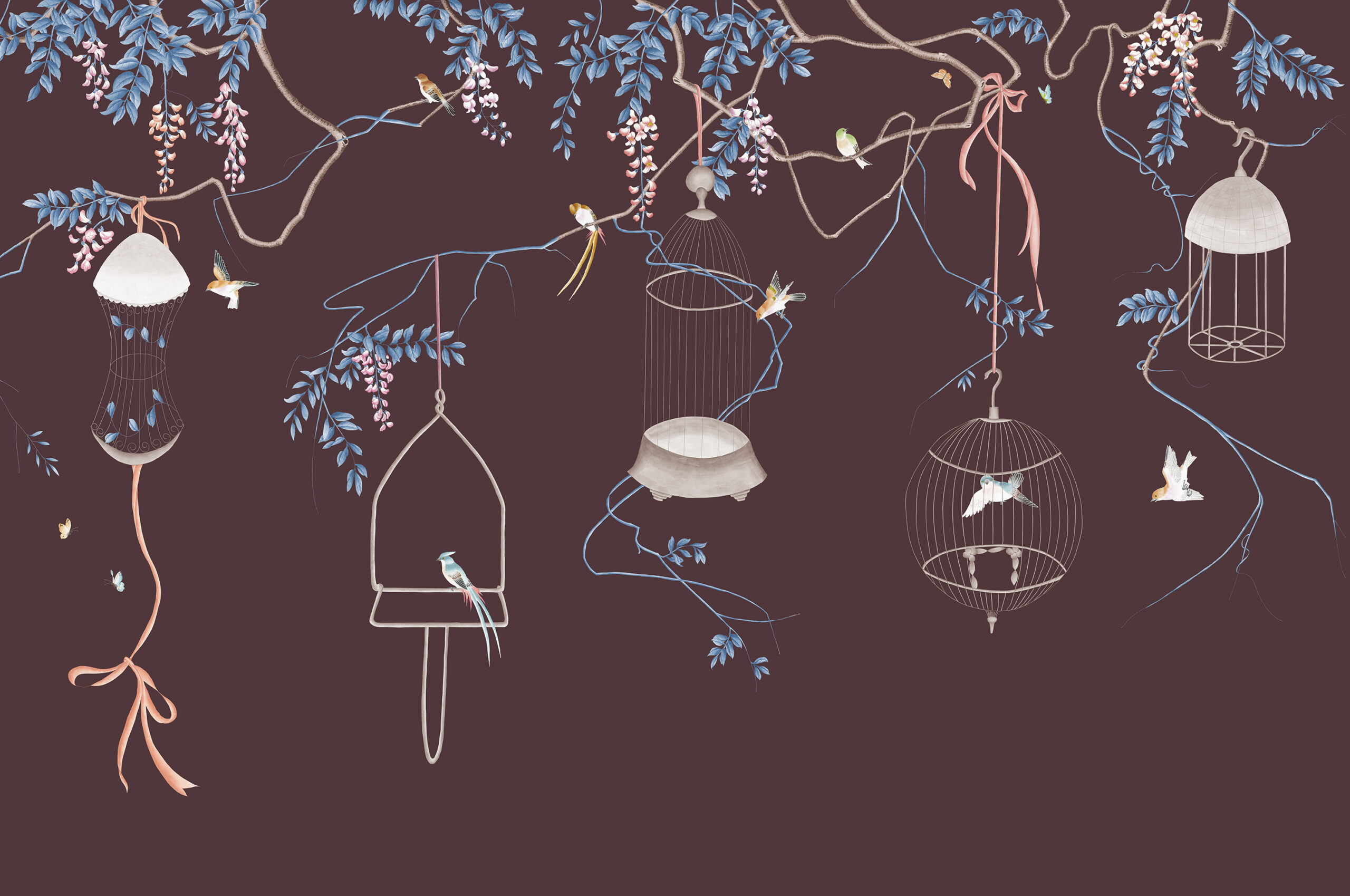Reminiscent of days gone by this delicate scene depicts the traditional activity of hanging birdcages in trees. The ornamental birdcage was made from fine materials, held high artistic value, and perfected in the Qing Dynasty. In this contemporary scene the cages are open, and the birds fly freely around the delicately painted buds and foliage.