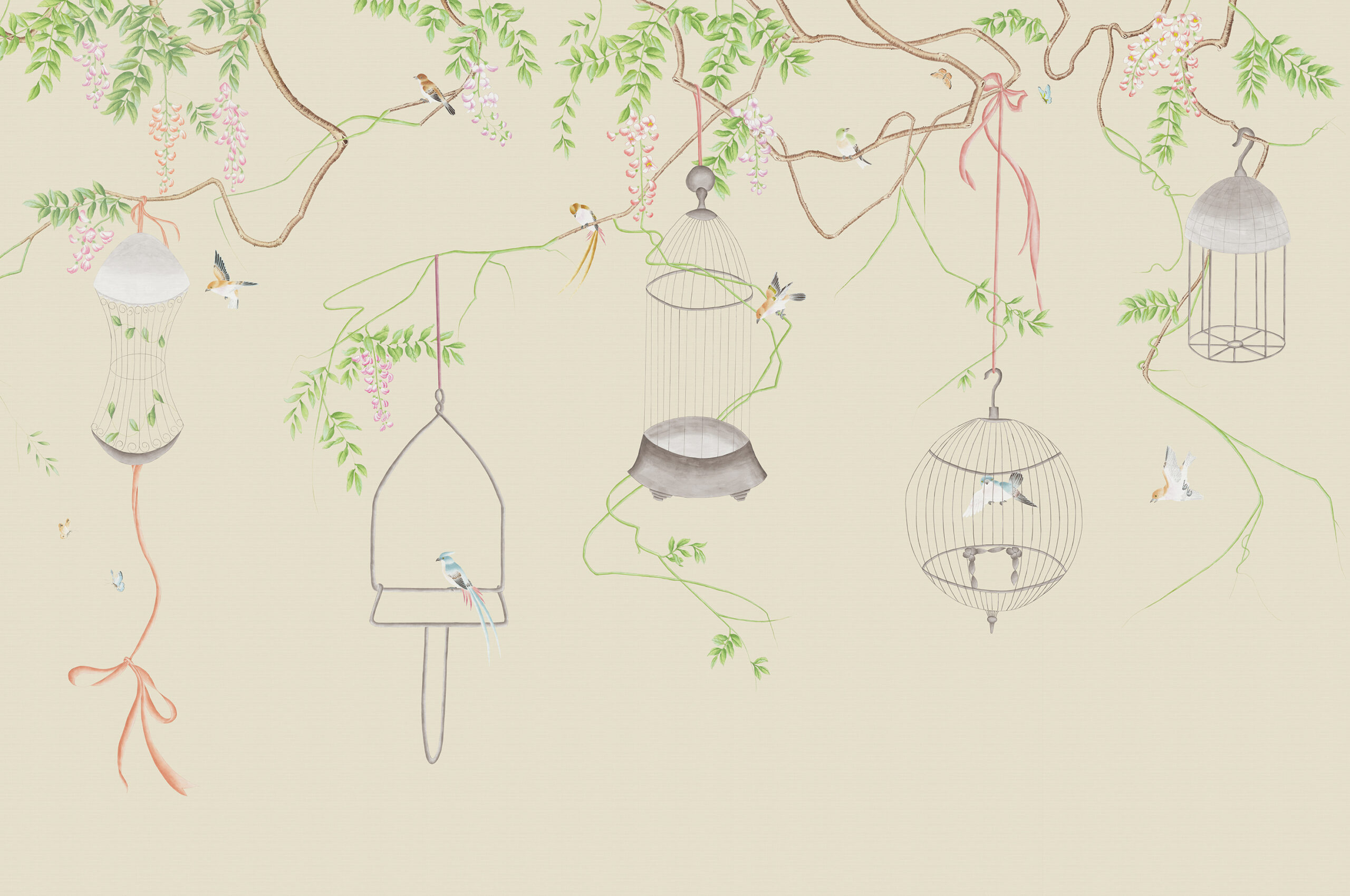 Reminiscent of days gone by this delicate scene depicts the traditional activity of hanging birdcages in trees. The ornamental birdcage was made from fine materials, held high artistic value, and perfected in the Qing Dynasty. In this contemporary scene the cages are open, and the birds fly freely around the delicately painted buds and foliage.