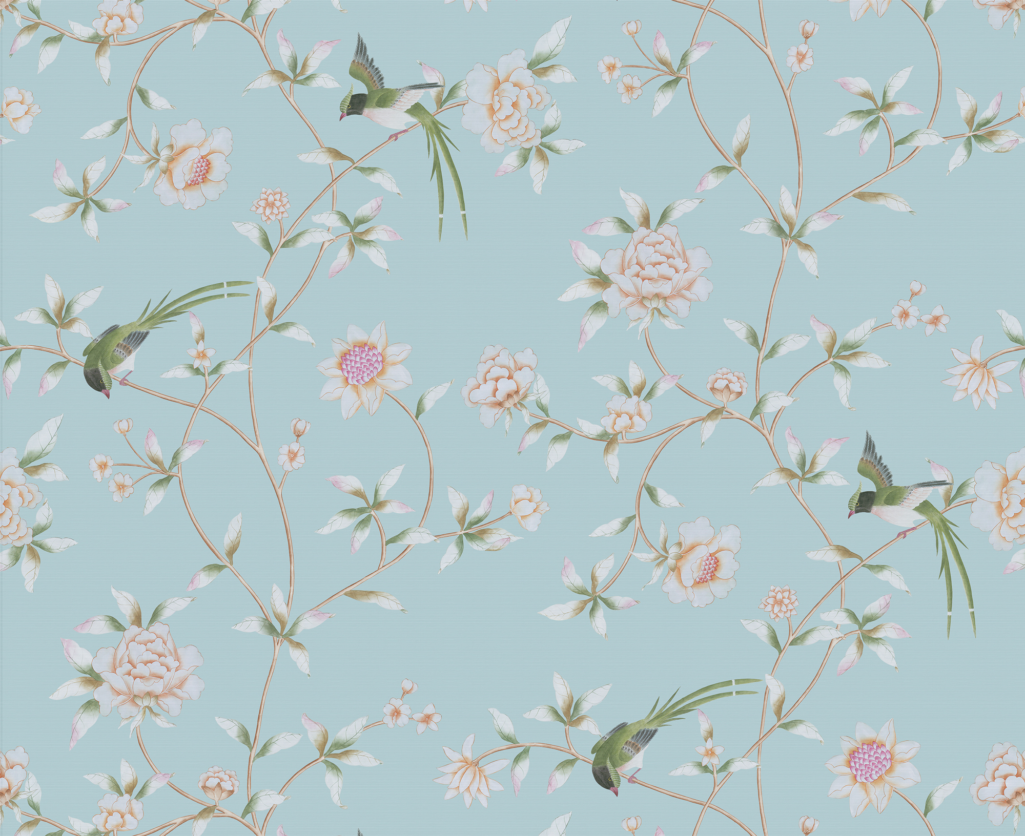 Precious long tailed birds adorn the delicate trailing flowers and branches in this charming design. A contemporary repeating layout ensures the design can be used in a contemporary and a traditional setting. It is particularly beautiful on gilded metallic or silk and is also suited to printing on natural textured grounds.