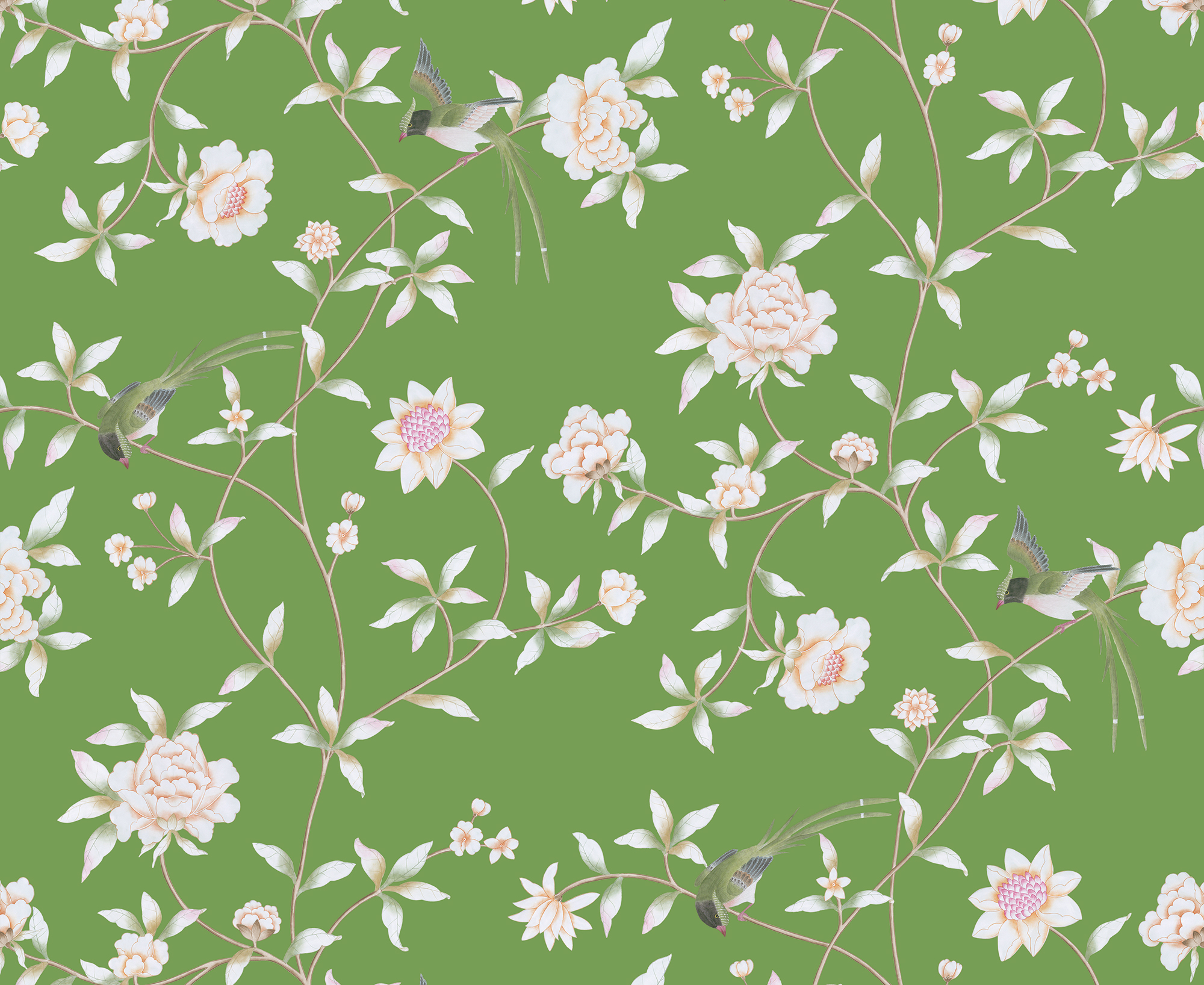 Precious long tailed birds adorn the delicate trailing flowers and branches in this charming design. A contemporary repeating layout ensures the design can be used in a contemporary and a traditional setting. It is particularly beautiful on gilded metallic or silk and is also suited to printing on natural textured grounds.