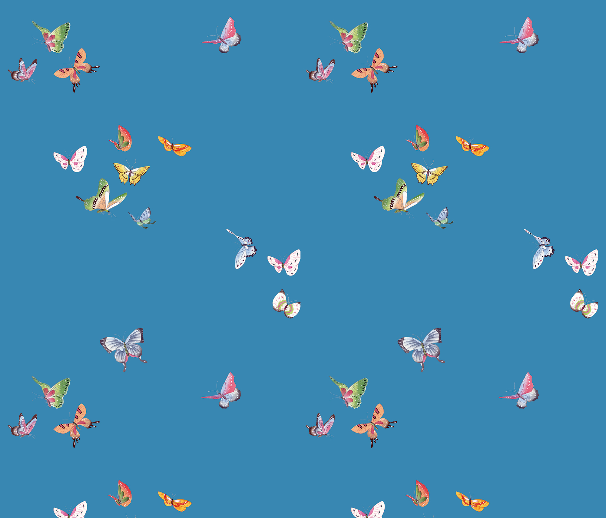 A symbol of grace, love and transformation in Eastern tradition, the butterfly here is painted flying freely. The mood and look of this intricate design can also be transformed by applying different colours to the background and to the pattern. This pretty imagery prints beautifully on silk, paper, gilded metallic and natural grasscloth.