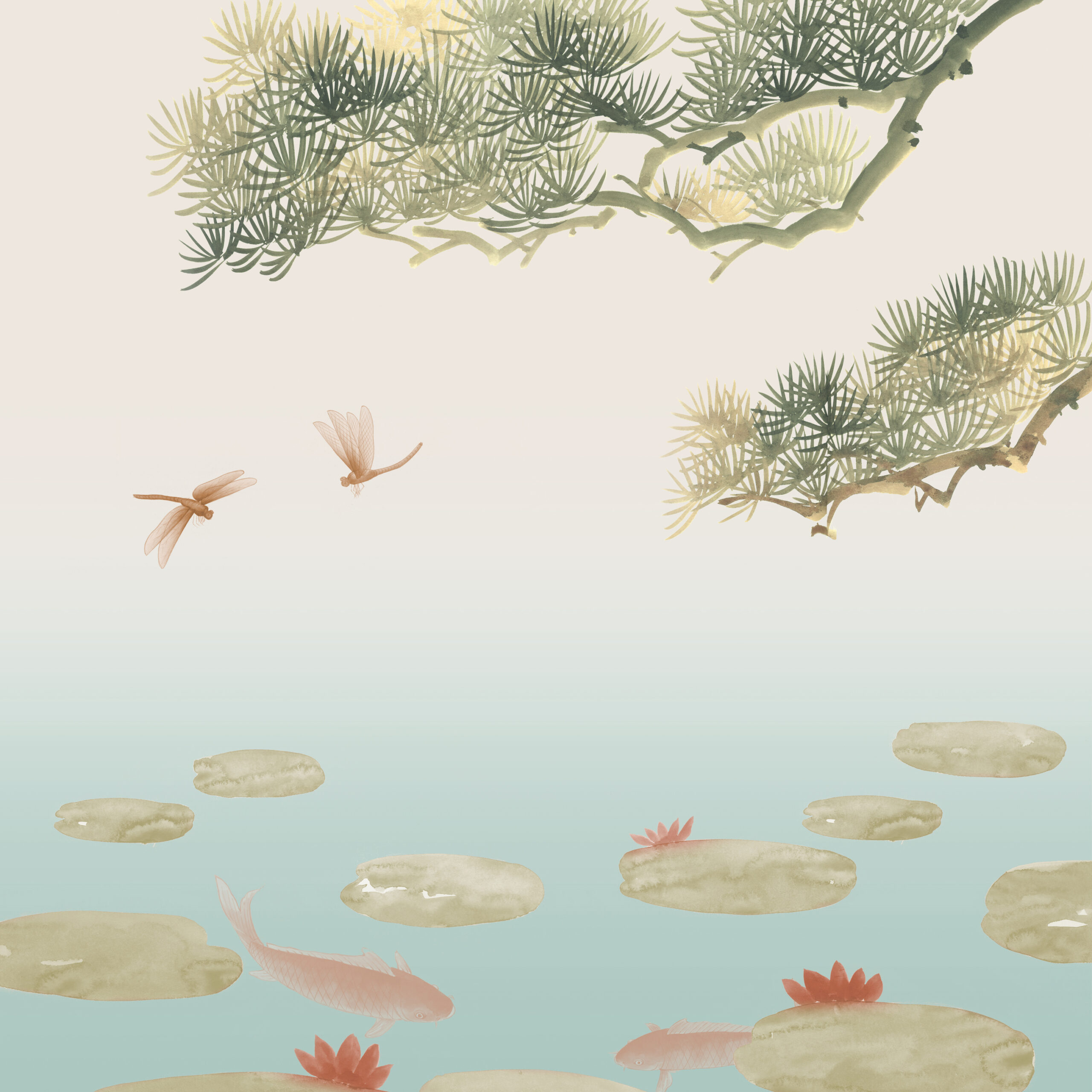 A charming and considered wallpaper depicting dragonflies hovering above a pool of water. Branches of Chinese cypress gently dip into the scene from above. Waterlilies and coy carp decorate the pool below. The dragonfly symbolises transformation, adaptability, and self-realisation in East Asian culture.