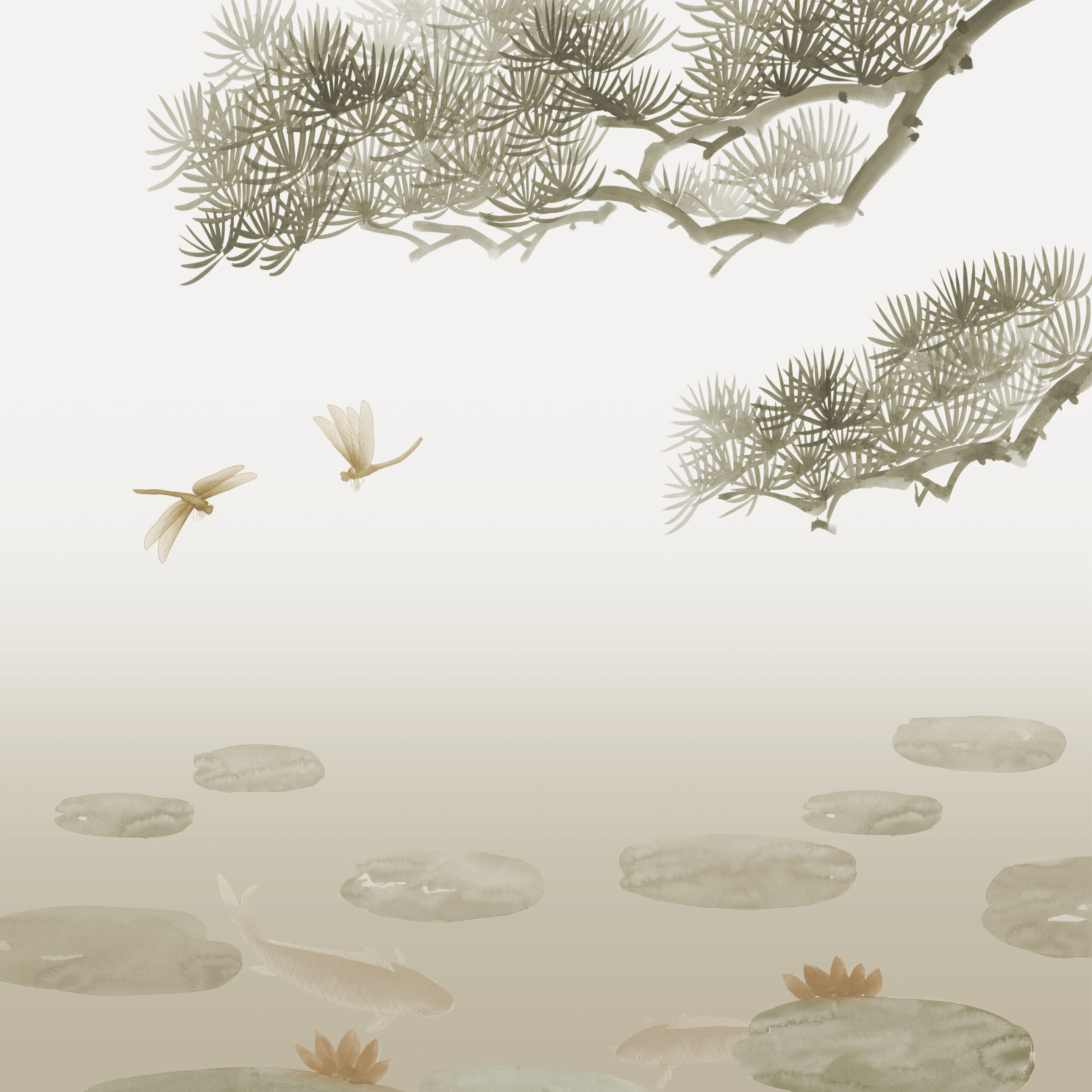 A charming and considered wallpaper depicting dragonflies hovering above a pool of water. Branches of Chinese cypress gently dip into the scene from above. Waterlilies and coy carp decorate the pool below. The dragonfly symbolises transformation, adaptability, and self-realisation in East Asian culture.