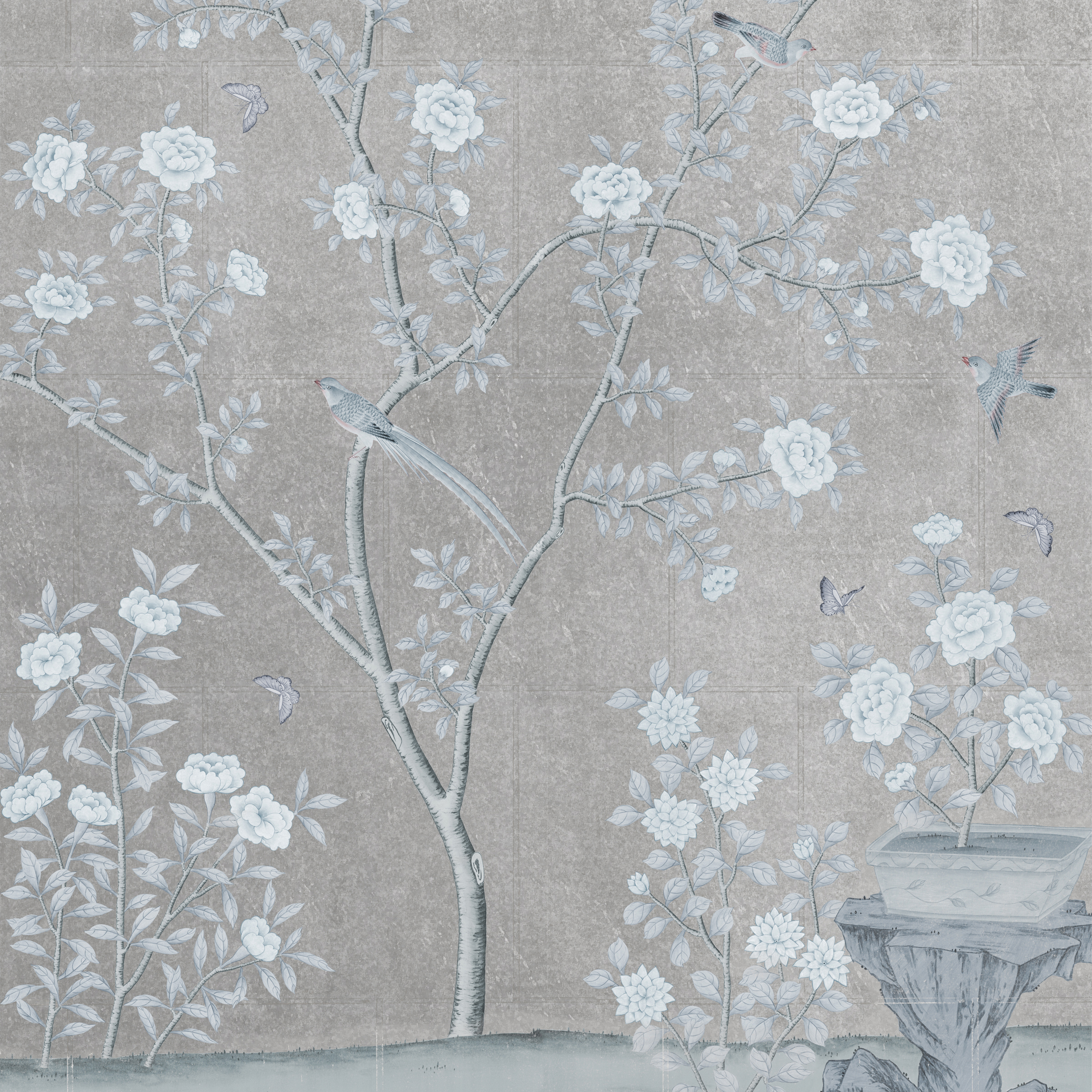 Elegant and contemporary, our Earls Court hand painted wallpaper features birds, flowers, and butterflies; popular motifs in the decorative art of chinoiserie.
