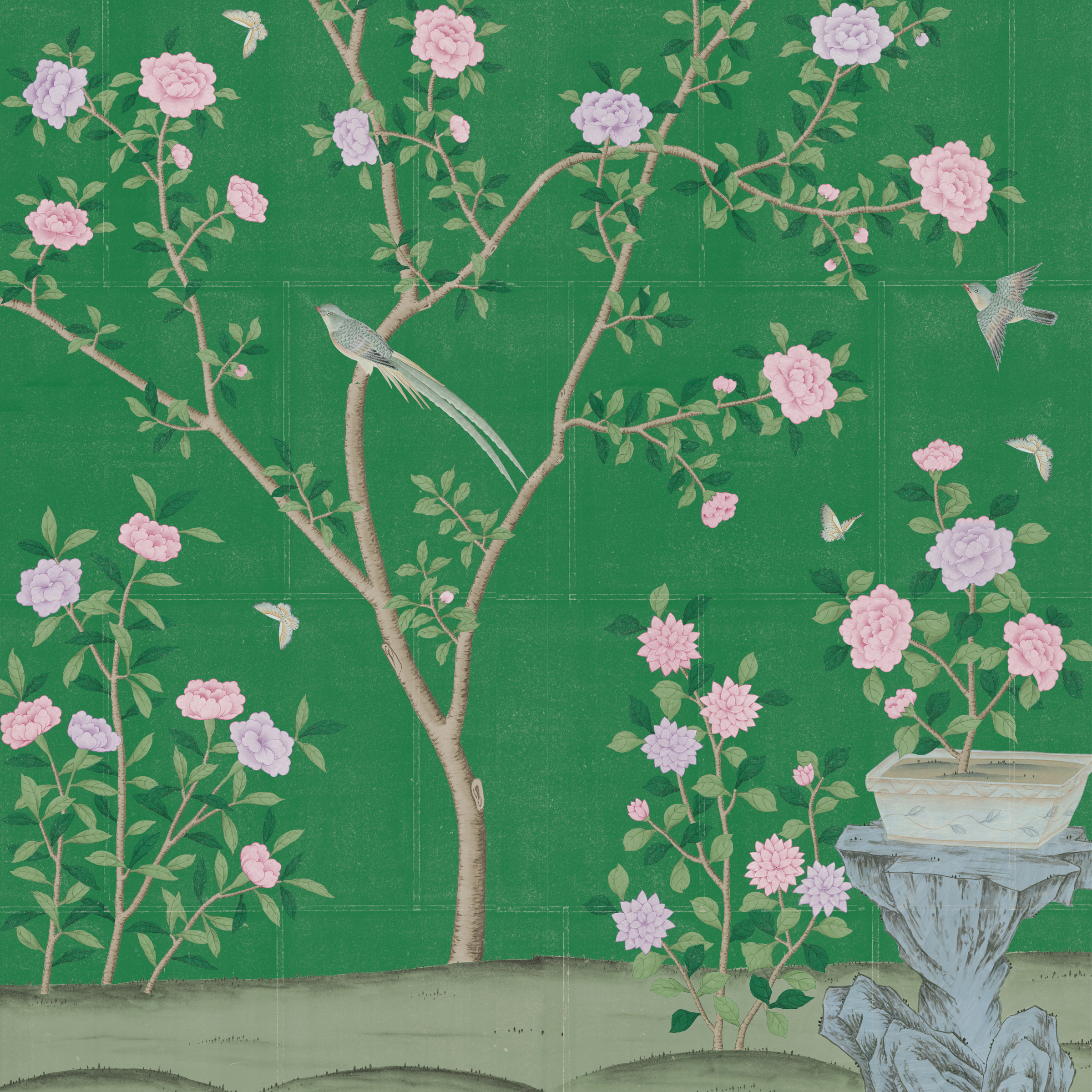 Elegant and contemporary, our Earls Court hand painted wallpaper features birds, flowers, and butterflies; popular motifs in the decorative art of chinoiserie.