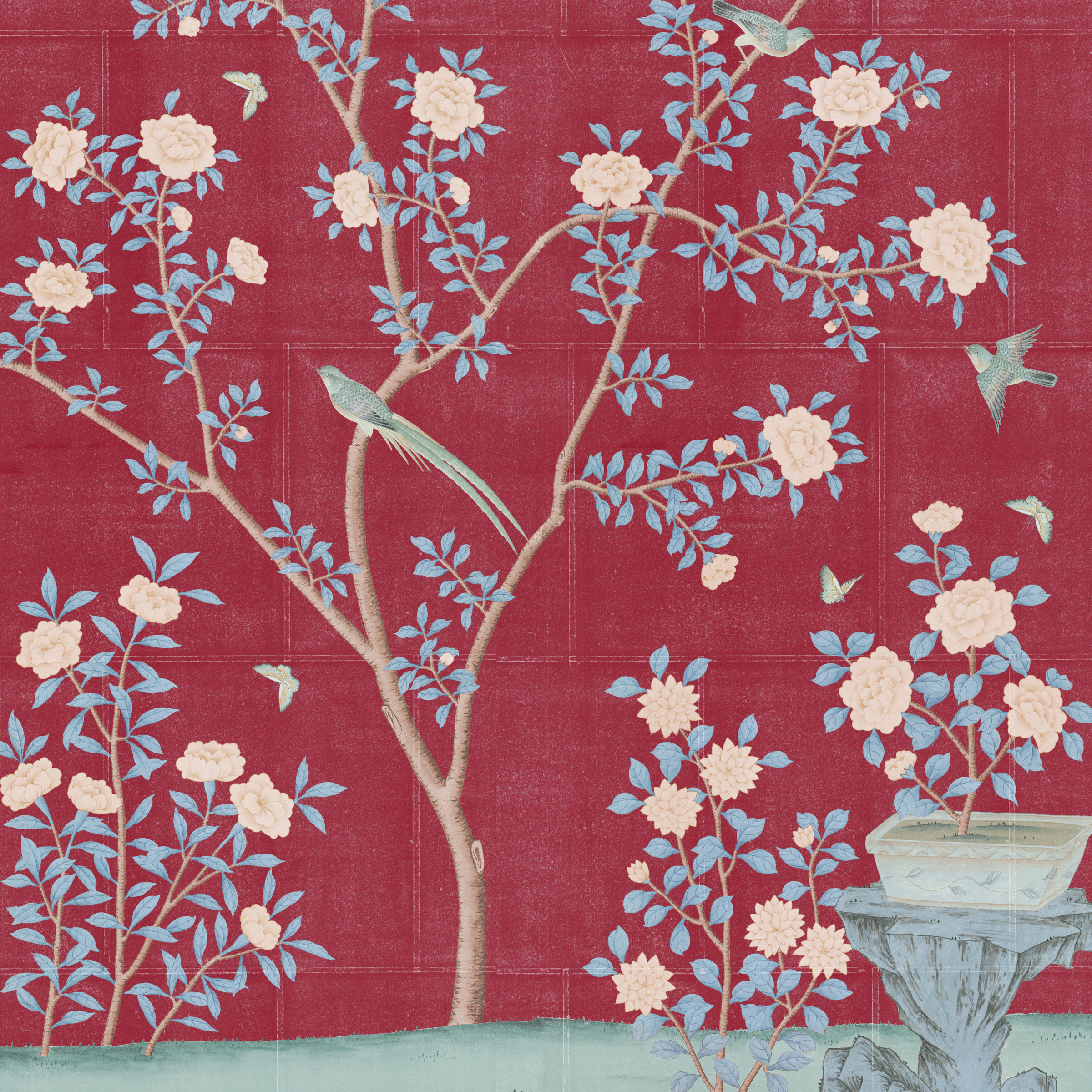 Elegant and contemporary, our Earls Court hand painted wallpaper features birds, flowers, and butterflies; popular motifs in the decorative art of chinoiserie.