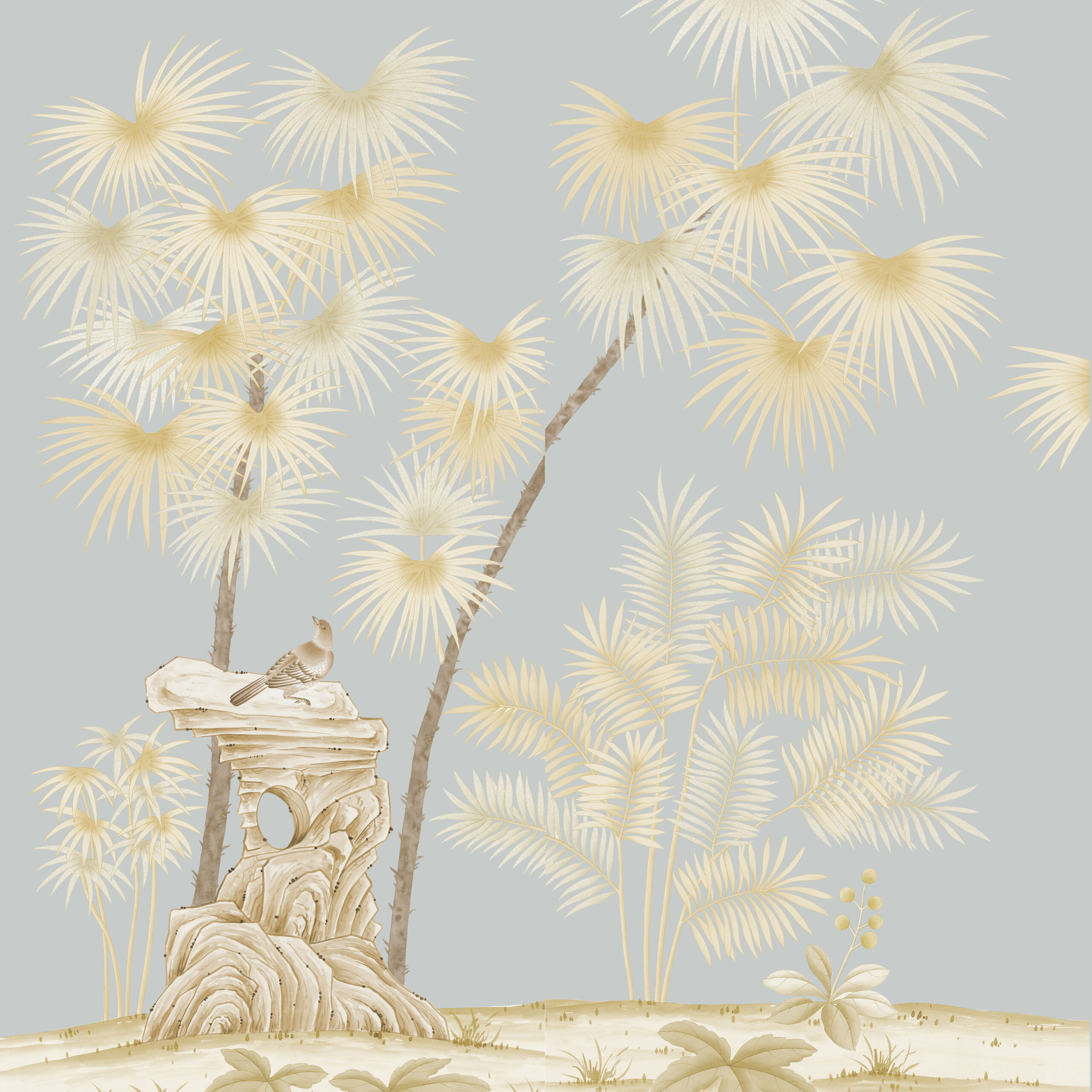 Lavishly painted Chinese windmill palm and Chinese fan palm trees give a tropical air to our hand painted Fan Palm design. In Ancient culture the palm leaves were used to write on, but here we paint them to illustrate their architectural stature and beauty.