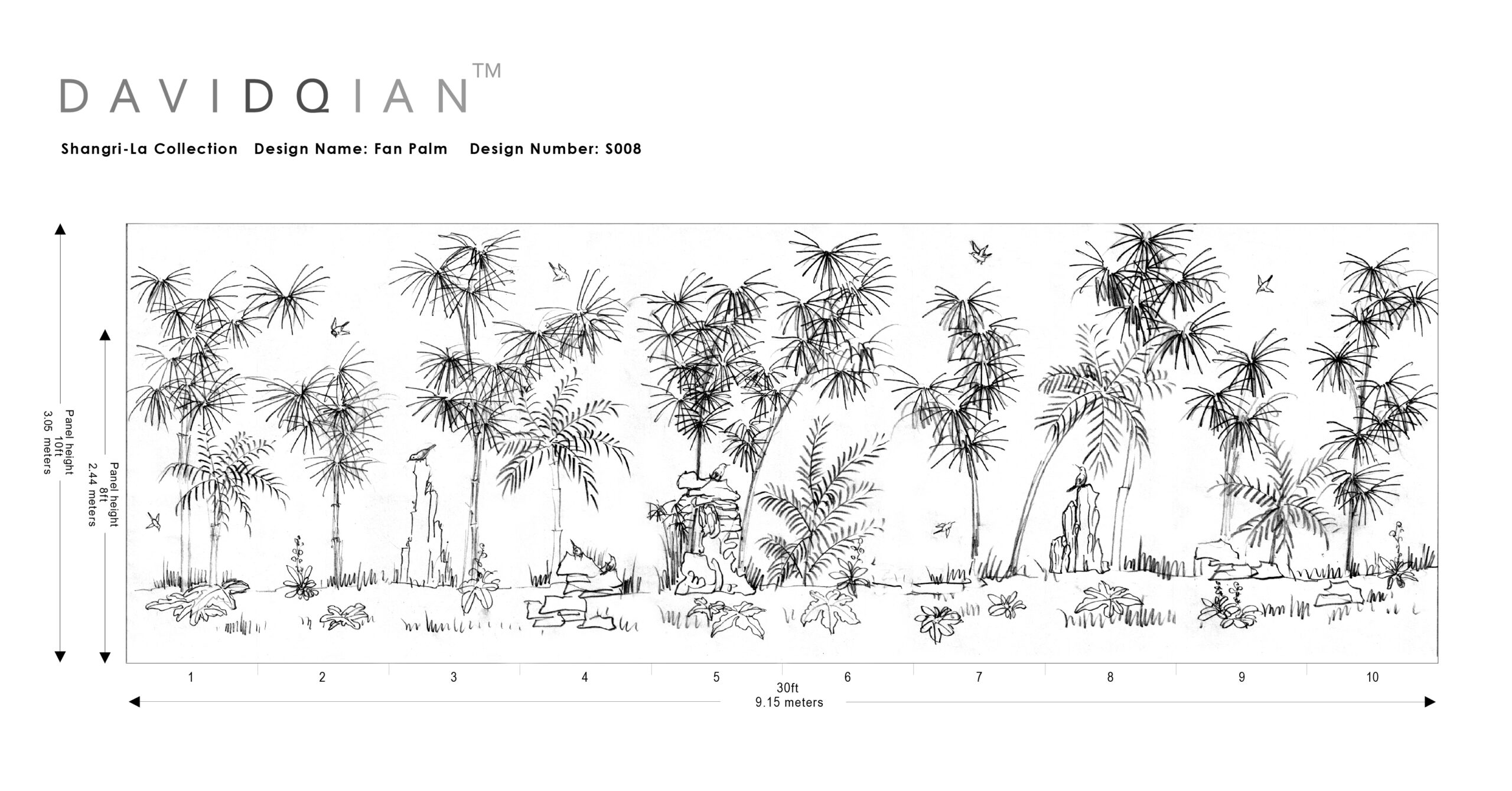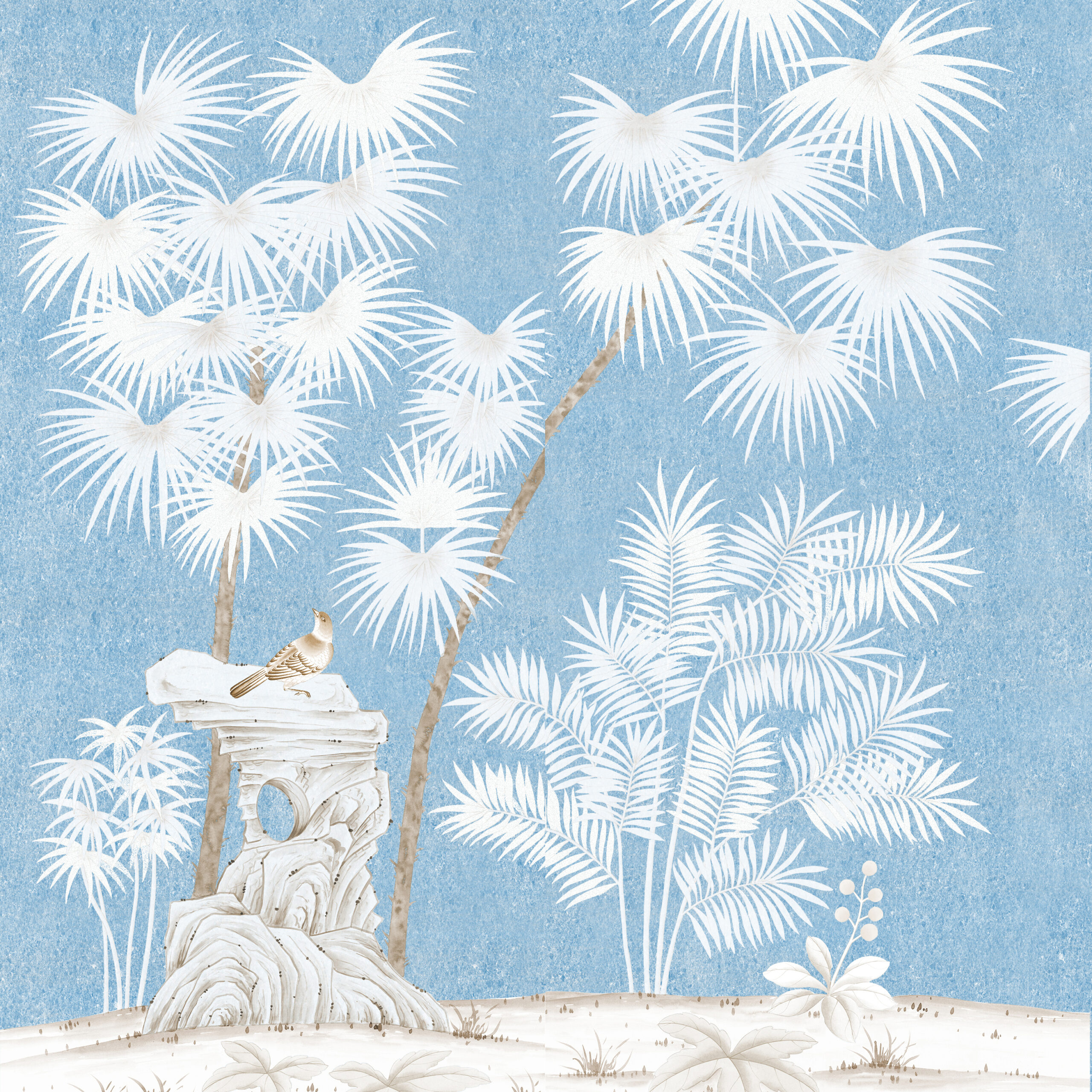 Lavishly painted Chinese windmill palm and Chinese fan palm trees give a tropical air to our hand painted Fan Palm design. In Ancient culture the palm leaves were used to write on, but here we paint them to illustrate their architectural stature and beauty.