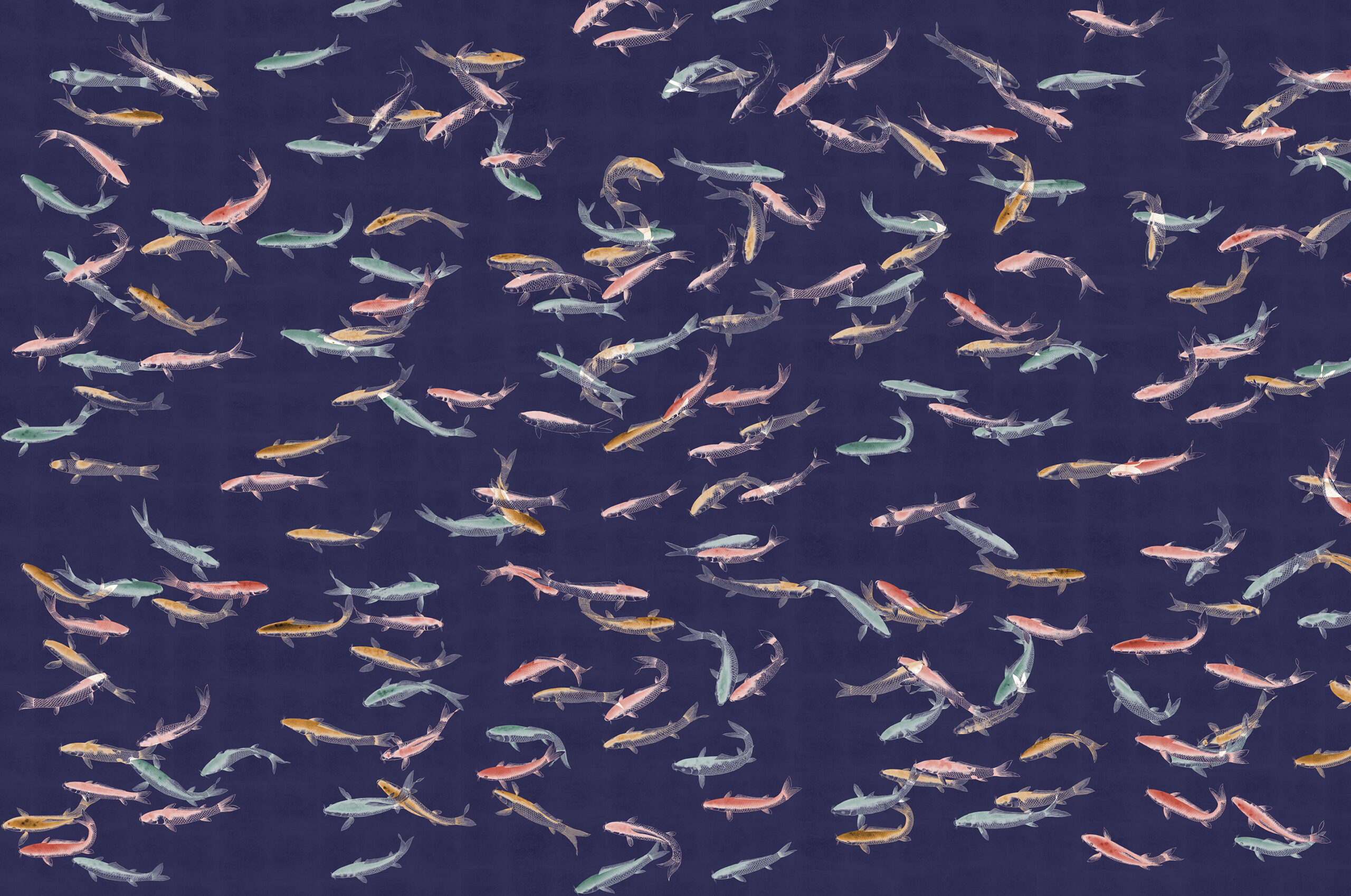 The Koi fish with its powerful and energetic life, demonstrated by its ability to swim against currents, represents good fortune, success, prosperity & courage. This beautiful serene design illustrates the prized Koi fish swimming gracefully in calm waters. A contemporary take on a traditional Eastern theme. The design looks amazing printed on silk or gilded metallic with a light or dark background colour.