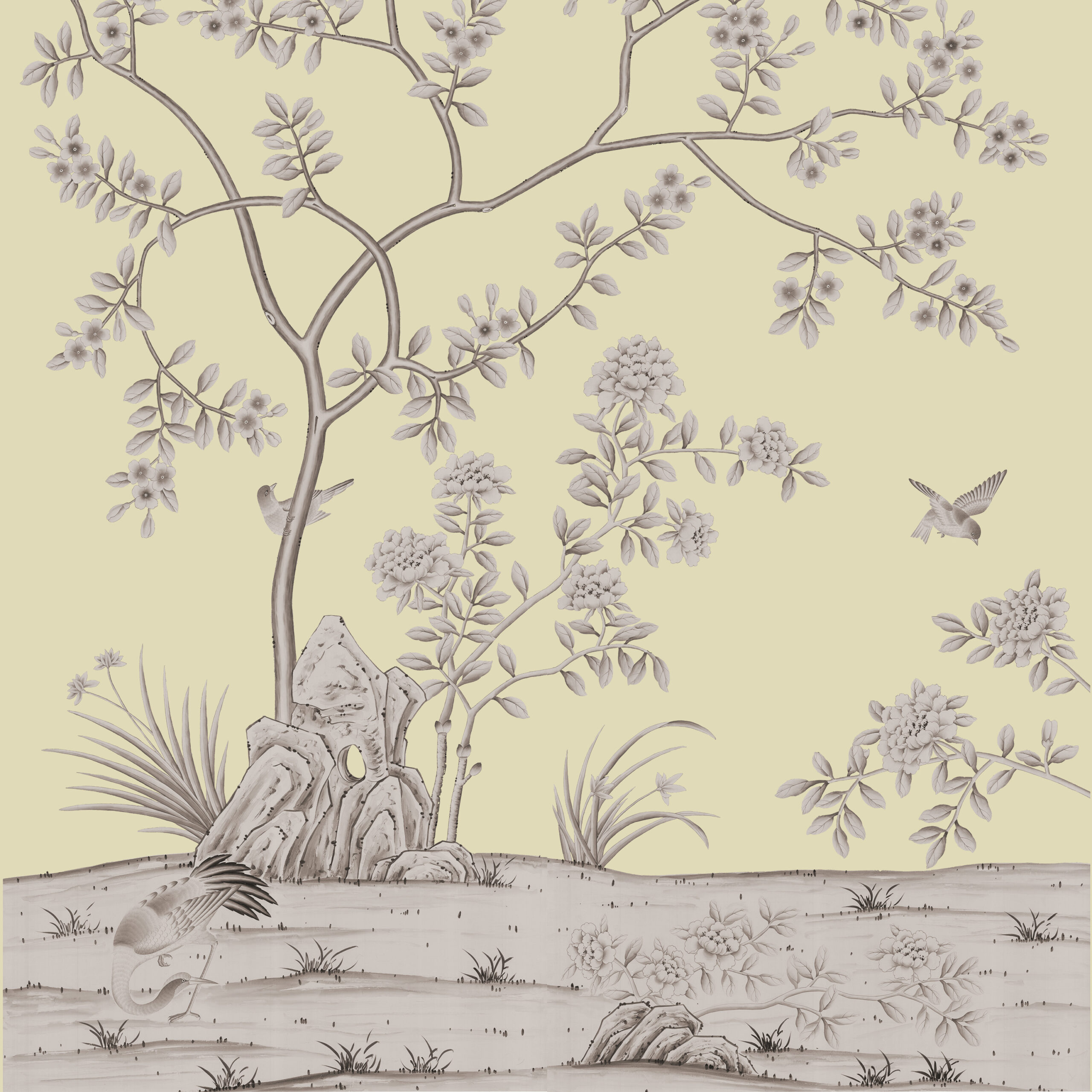 A graceful scene of rich flora and fauna, including bamboo and delicate ornamental trees. The earliest known flowering plant is the majestic magnolia, symbolising purity and nobility, this features alongside an array of beautiful birds in our hand painted wallpaper Four Seasons.