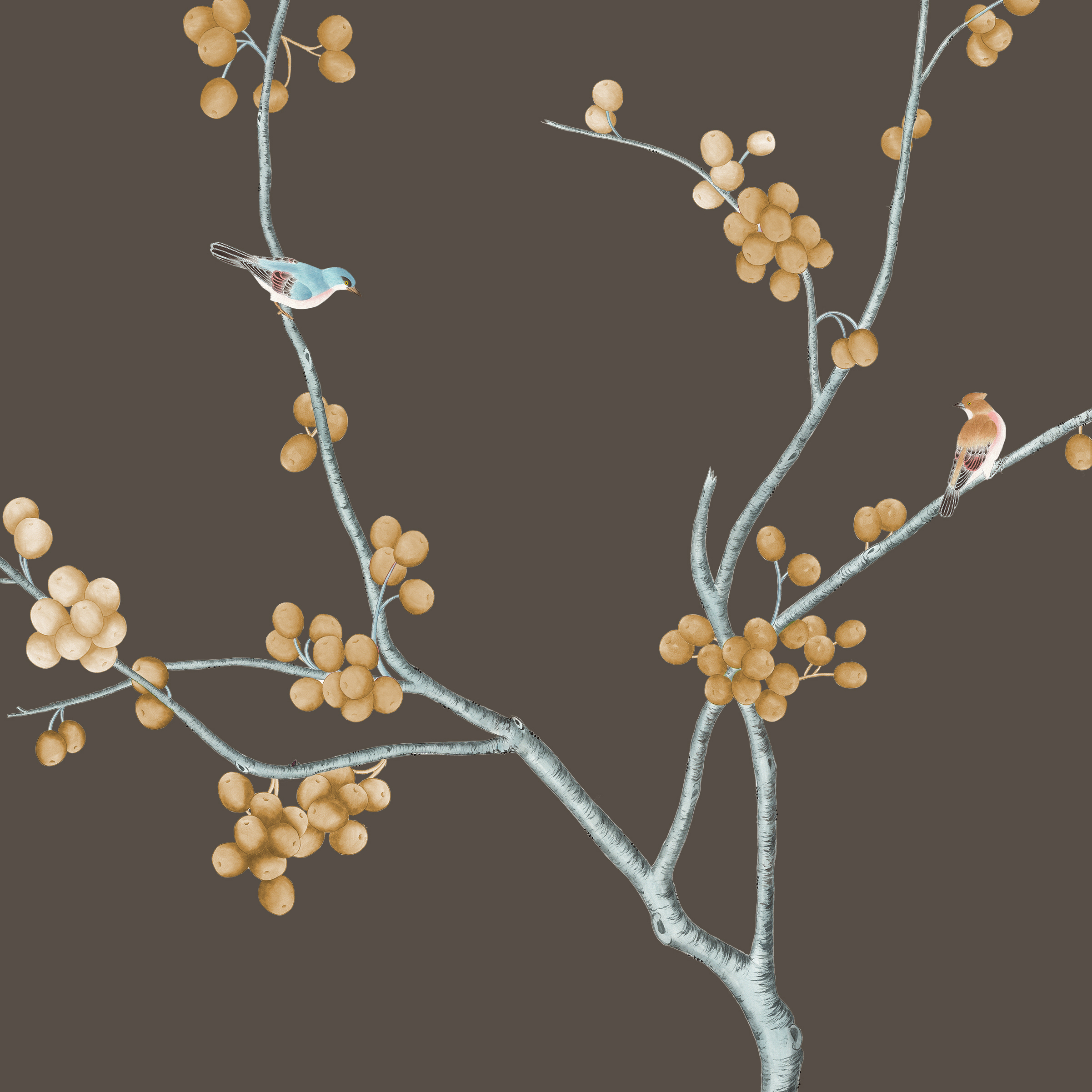 The outlines of the fruits stand proud in the background, creating a truly three-dimensional wallpaper. The fruits attract a variety of multicoloured birds which fly from tree to tree – a popular motif in the decorative art of chinoiserie