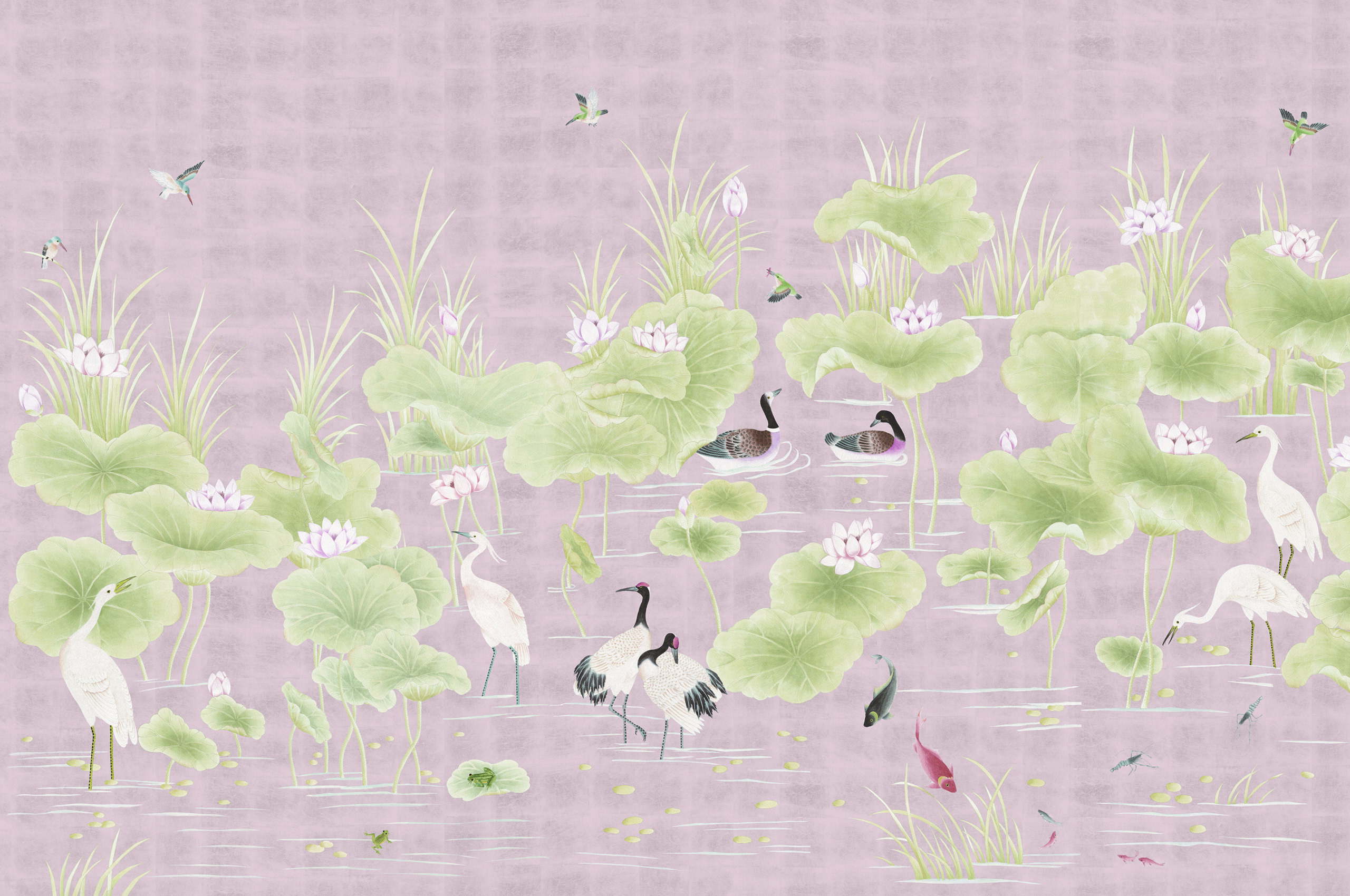 A tranquil scene filled with sacred lotus flowers and waterlilies, both prominent images within Eastern Culture. The Ornamental lotus flower is symbolic of purity, beauty, majesty, serenity and grace, and features alongside water birds including geese, the blue iridescent kingfisher, and the tallest of flying birds, the sarus crane. Japanese koi carp, frogs and shrimp can be seen dotted playfully about the water’s edge.
