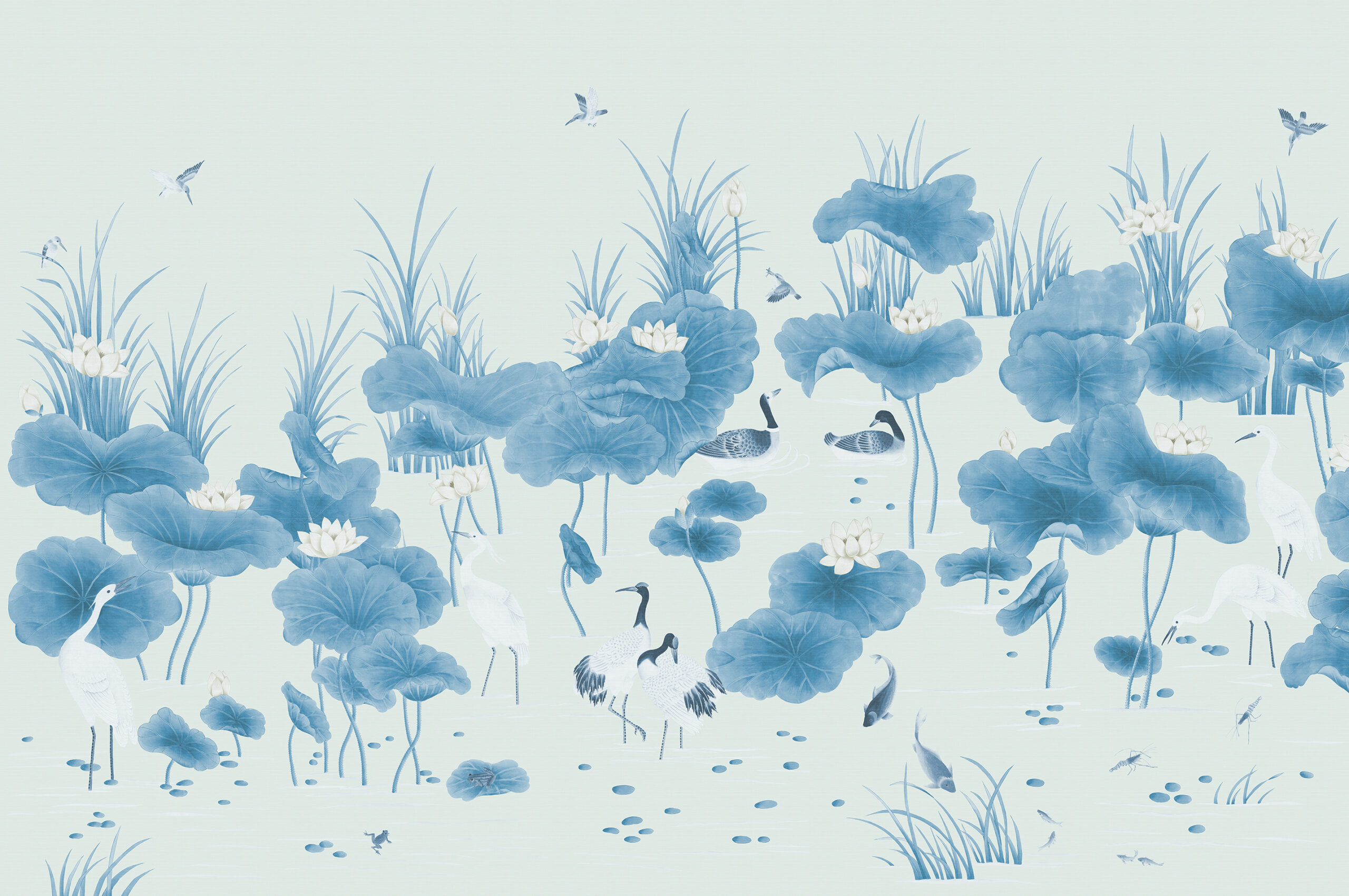 A tranquil scene filled with sacred lotus flowers and waterlilies, both prominent images within Eastern Culture. The Ornamental lotus flower is symbolic of purity, beauty, majesty, serenity and grace, and features alongside water birds including geese, the blue iridescent kingfisher, and the tallest of flying birds, the sarus crane. Japanese koi carp, frogs and shrimp can be seen dotted playfully about the water’s edge.