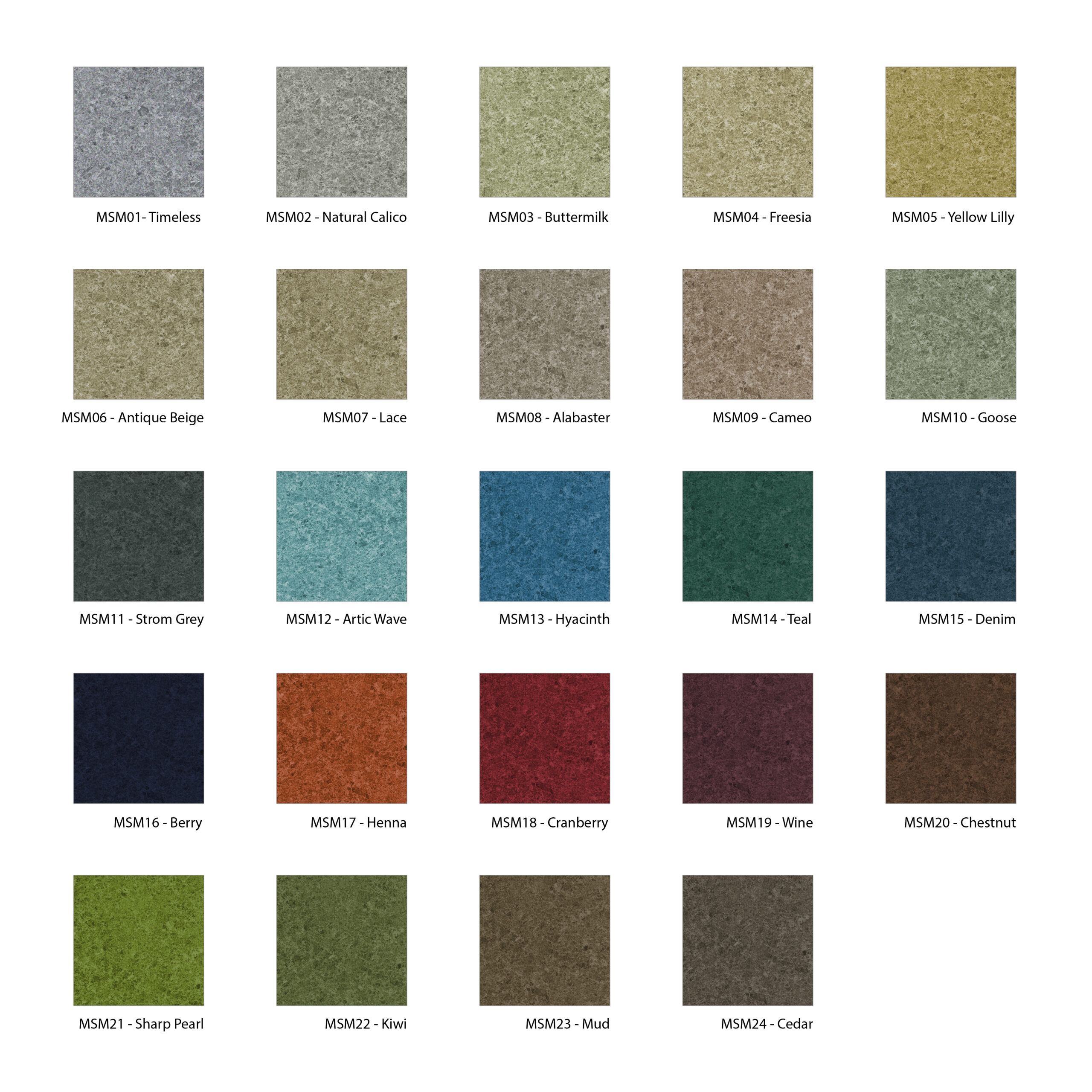 | COLOUR | MSM01 Timeless, MSM02 Natural Calico, MSM03 Buttermilk, MSM04 Freesia, MSM05 Yellow Lilly, MSM06 Antique Beige, MSM07 Lace, MSM08 Alabaster, MSM09 Cameo, MSM10 Goose, MSM11 Strorm Grey, MSM12 Artic Wave, MSM13 Hyacinth, MSM14 Teal, MSM15 Denim, MSM16 Berry, MSM17 Henna, MSM18 Cranberry, MSM19 Wine, MSM20 Chestnut, MSM21 Sharp Pearl, MSM22 Kiwi, MSM23 Mud, MSM24 Cedar, N/A |