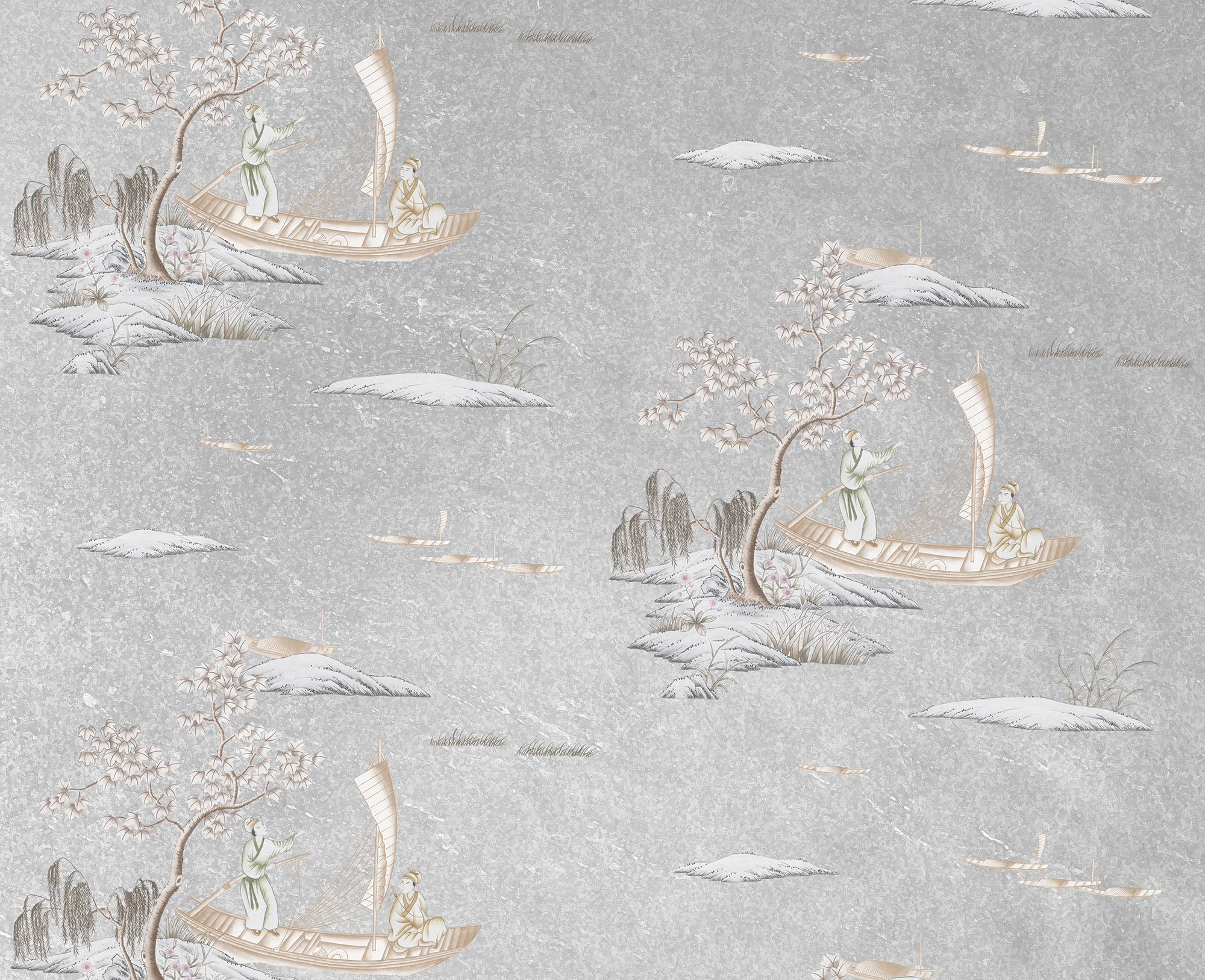 A moment in time depicting a boat travelling the centuries-old medieval moat connecting the two lakes of Shanhu and Ronghu in the ancient city of Guilin. The boat passes a small island with weeping willow in this classical conversational piece drawn in a contemporary hand in a repeating pattern. Designed to fit both traditional and contemporary schemes.