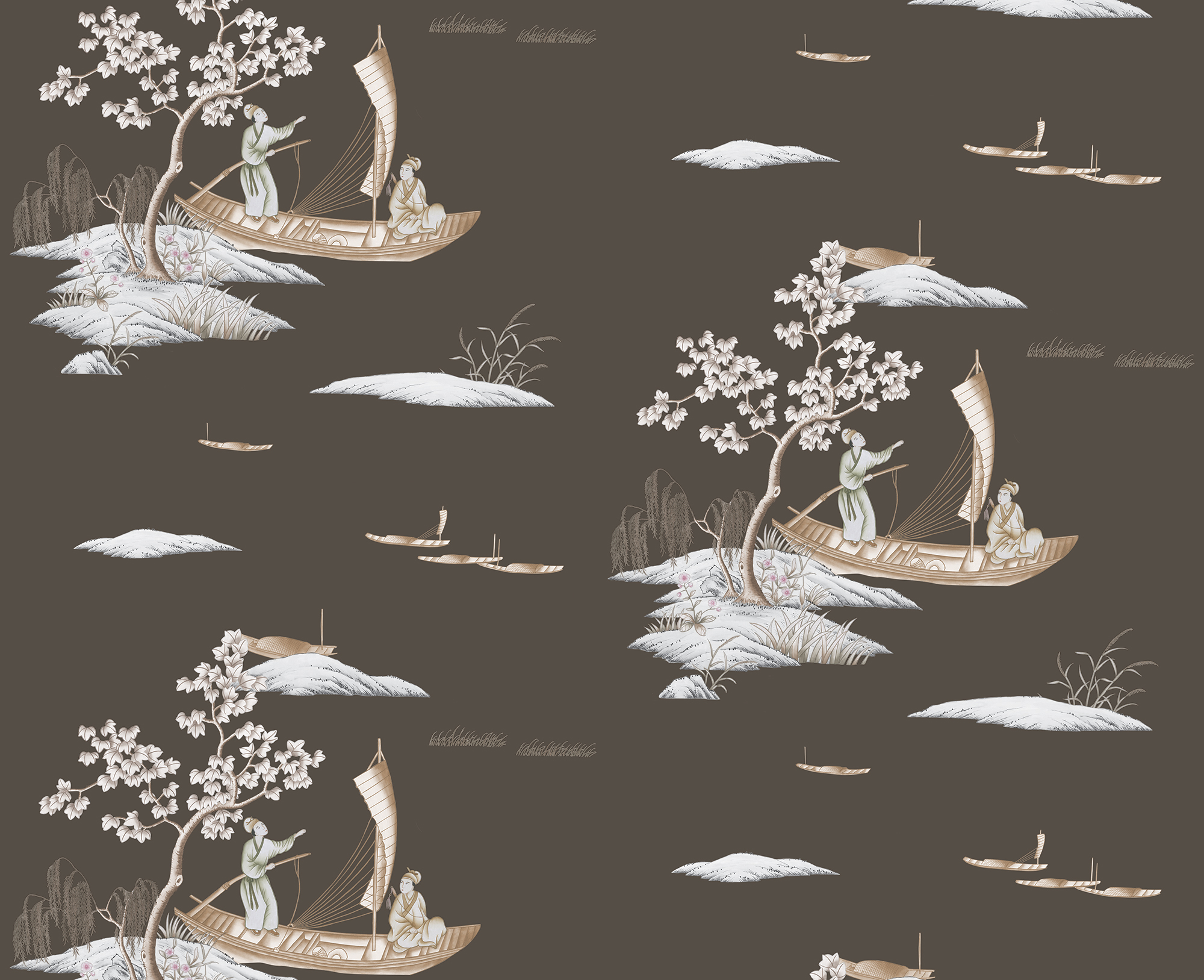 A moment in time depicting a boat travelling the centuries-old medieval moat connecting the two lakes of Shanhu and Ronghu in the ancient city of Guilin. The boat passes a small island with weeping willow in this classical conversational piece drawn in a contemporary hand in a repeating pattern. Designed to fit both traditional and contemporary schemes.