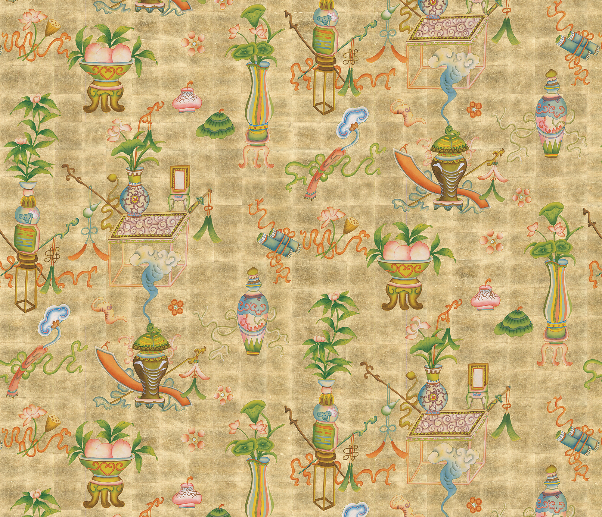 The design beautifully illustrates items of ancient tradition such as intricate porcelain or bronze pots and urns. Symbols of good luck and long life in Eastern tradition, these ancient artefacts are exquisitely depicted filled with fruit and flowers. This pattern looks great in a variety of colours with a dark or pale background.