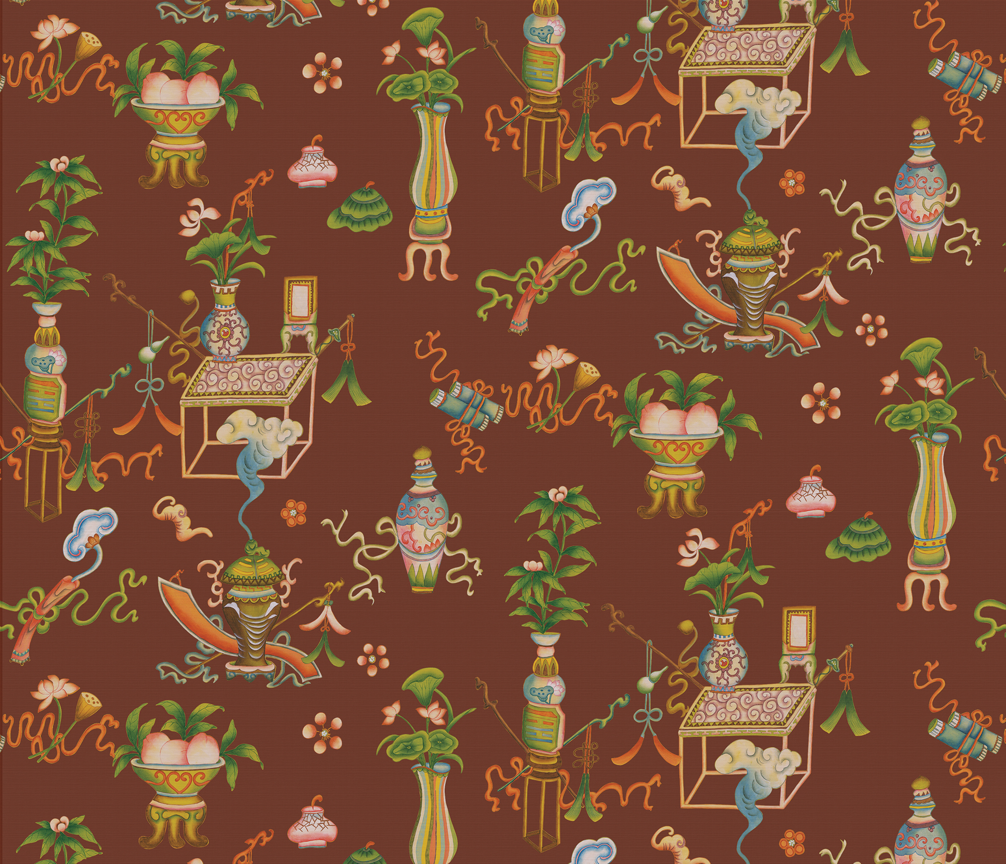 The design beautifully illustrates items of ancient tradition such as intricate porcelain or bronze pots and urns. Symbols of good luck and long life in Eastern tradition, these ancient artefacts are exquisitely depicted filled with fruit and flowers. This pattern looks great in a variety of colours with a dark or pale background.