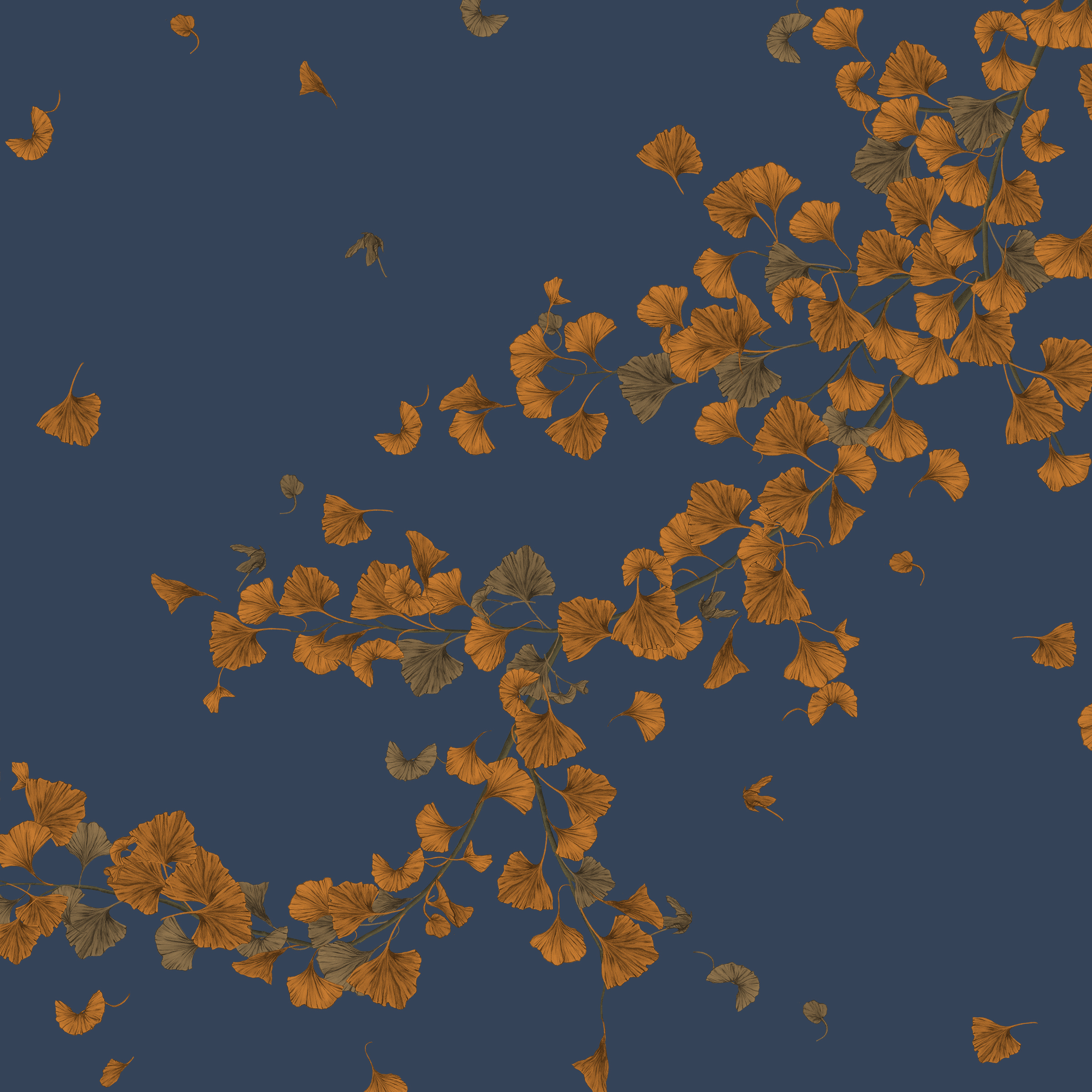 A delightful and contemporary representation of the elegant Chinese ginkgo tree, with its distinctive fan shaped leaves falling delicately to the ground, leaving the tree branches trailing softly behind. In Japanese decorative art the ginkgo is a symbol of longevity and profound endurance as it can live for thousands of years.