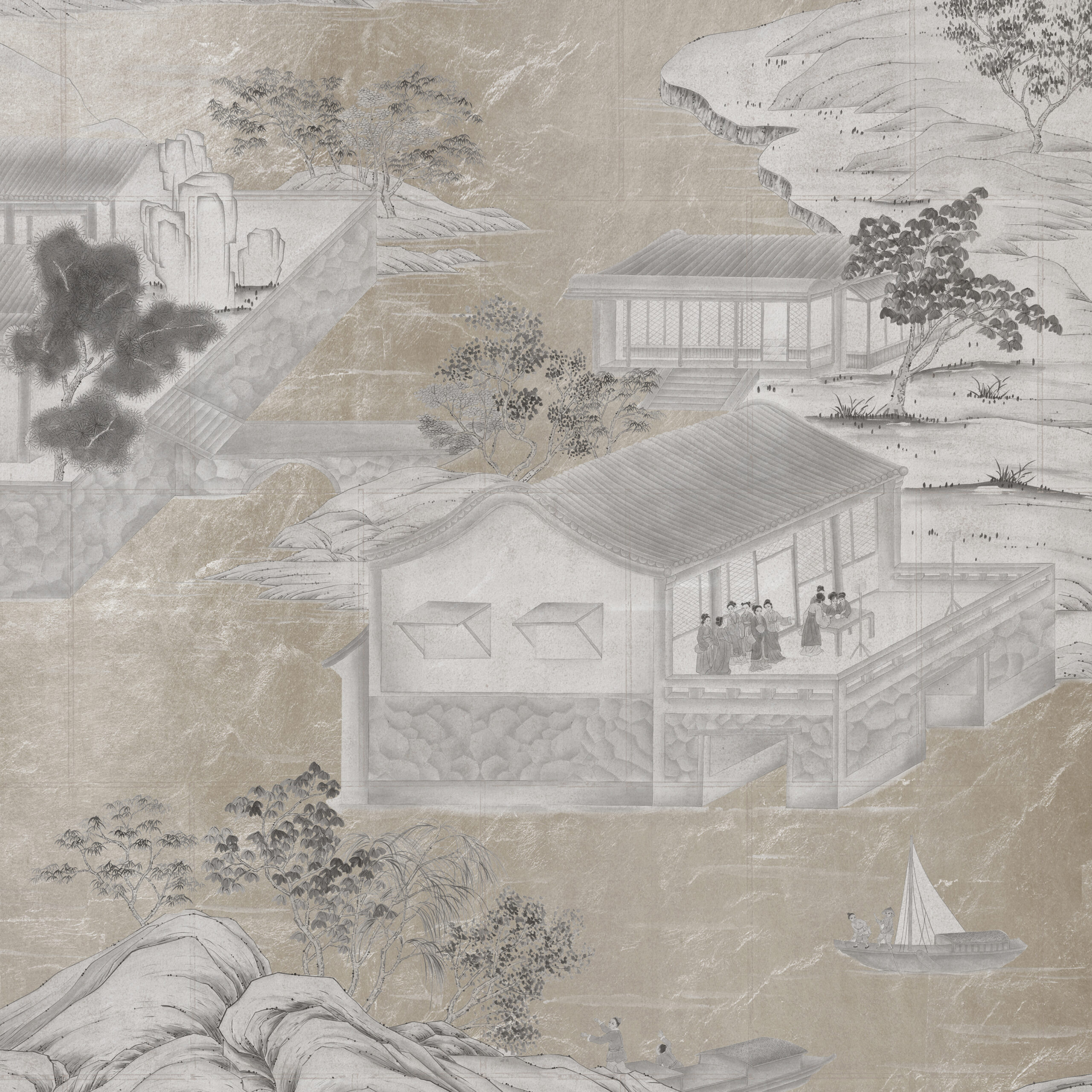 Tags: Champagne Gold, Chinoiseries, Hand Painted, Landscape, Mural, Pieced and Glued Metallic, Traditional