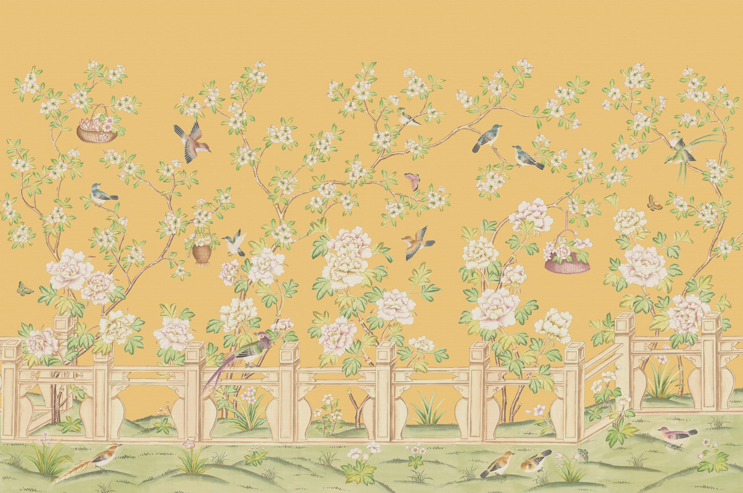 A graceful representation of a Chinese garden with a meandering path. Baskets containing delicate flowers hang from trees, and the ancient wall leads you through this blissful Lijiang garden. Birds, flowers and butterflies, popular motifs in the decorative art of chinoiserie, feature throughout the tranquil scene. The design is really beautiful in a lively or natural colour palette, printed on silk or gilded metallic.