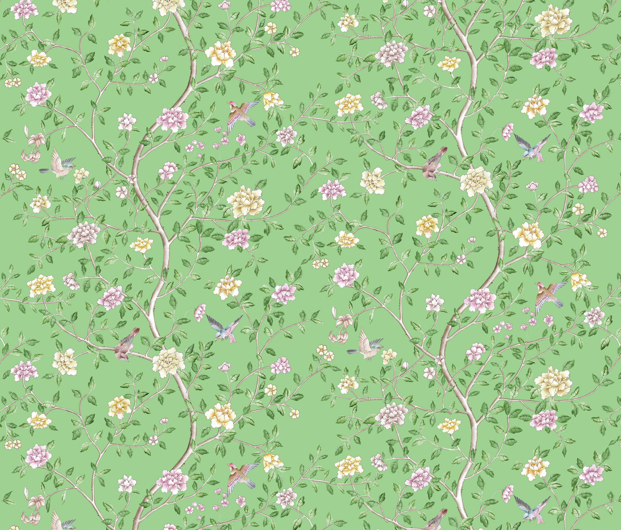 Birds and flowers, popular motifs in the decorative art of chinoiserie, fly amongst the climbing foliage in this design. The artist has paid great attention to create a wealth of detail in the leaves, flowers and birds. The design is illustrated particularly well when printed on silk, paper or gilded metallic as the detail is sharp and precise.