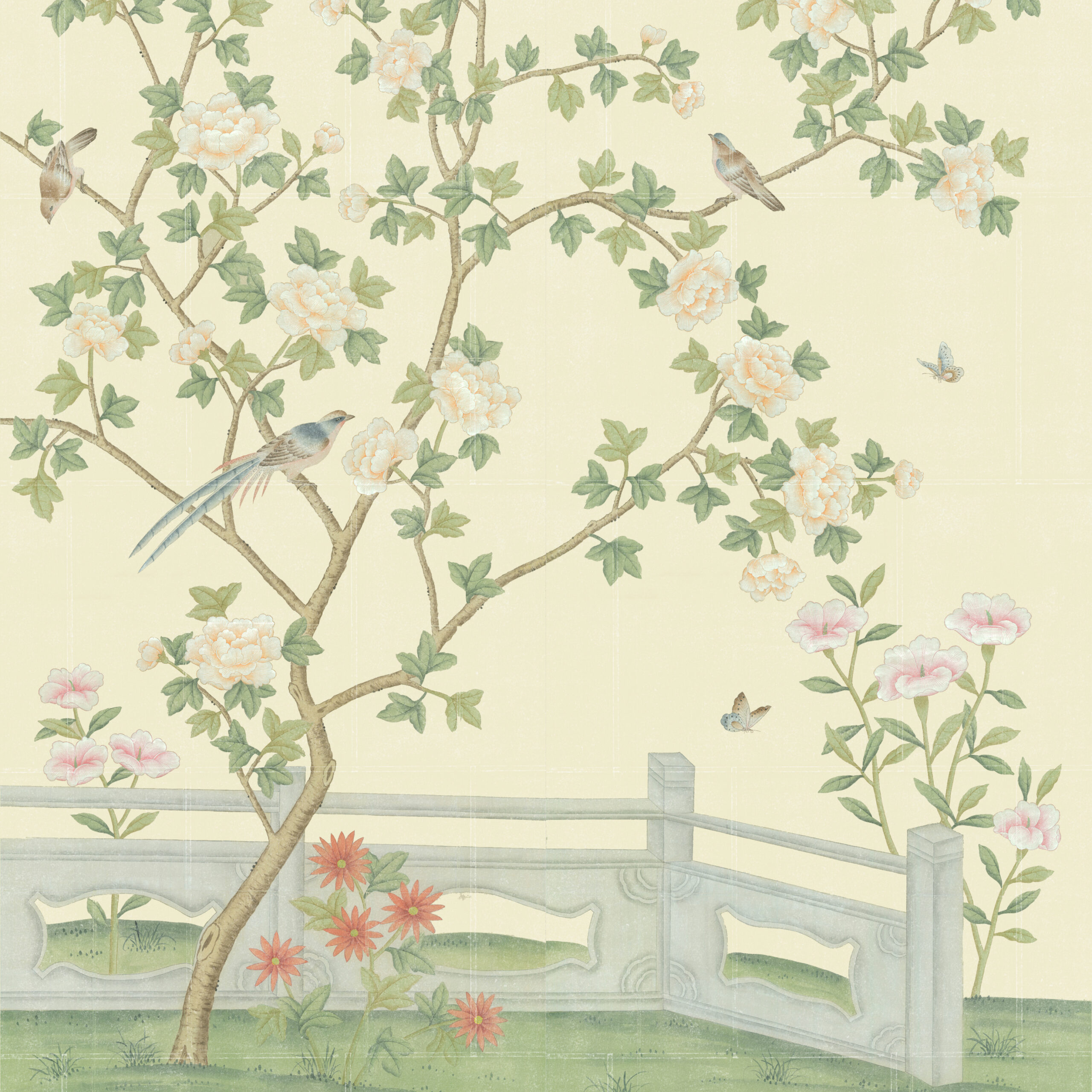 Flowering trees with outstretched branches provide space for the handsome long tailed golden pheasants in our Holland Park design. The path is marked by a low-level ancient wall, and sarus cranes gather at a pond concealed by lily pads.