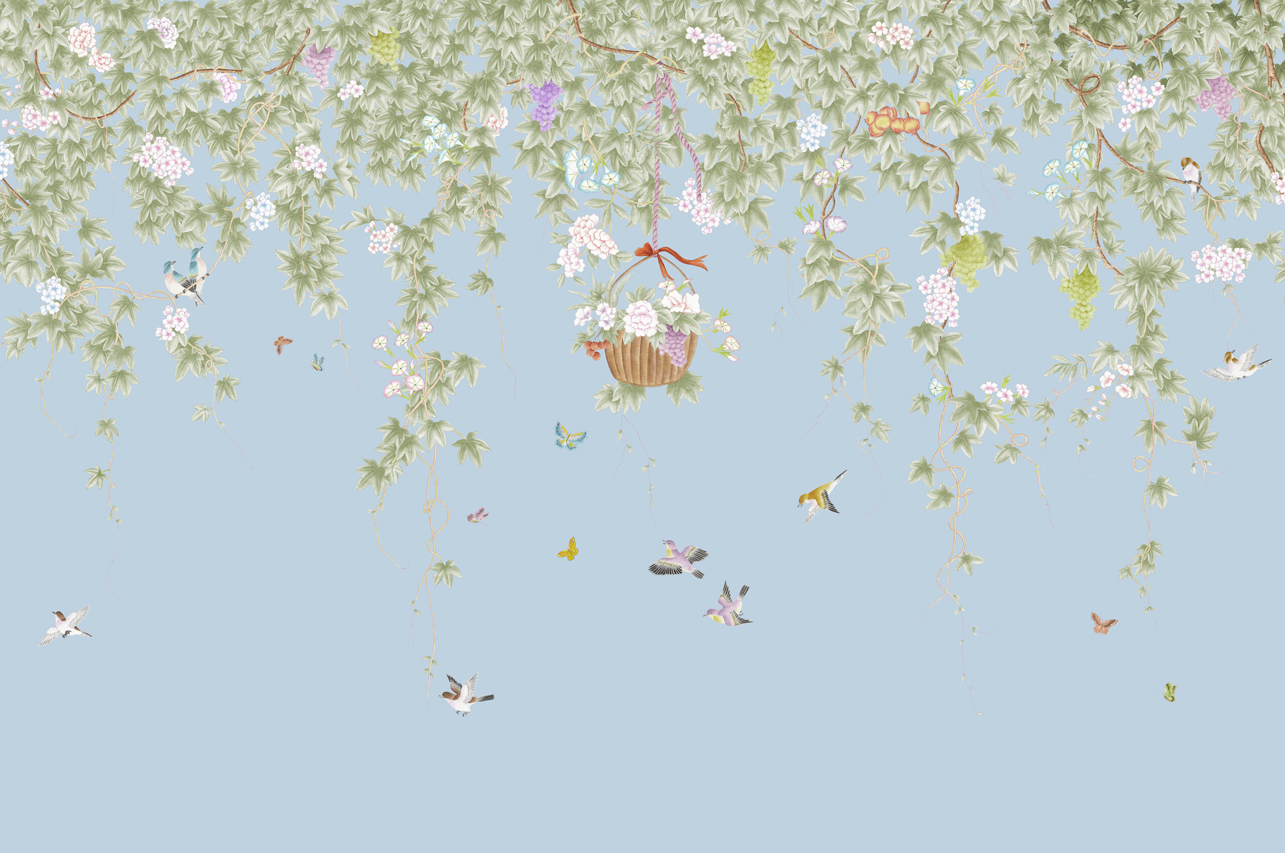 This scene near the ancient city of Lijiang Old Town features a passageway with grape vines hanging above. It was a favourite pastime to walk under such vines in the quiet shade of a humble garden. The hanging vines are softly highlighted with flowers, butterflies and birds. A room decorated with this pattern provides a very unique look.