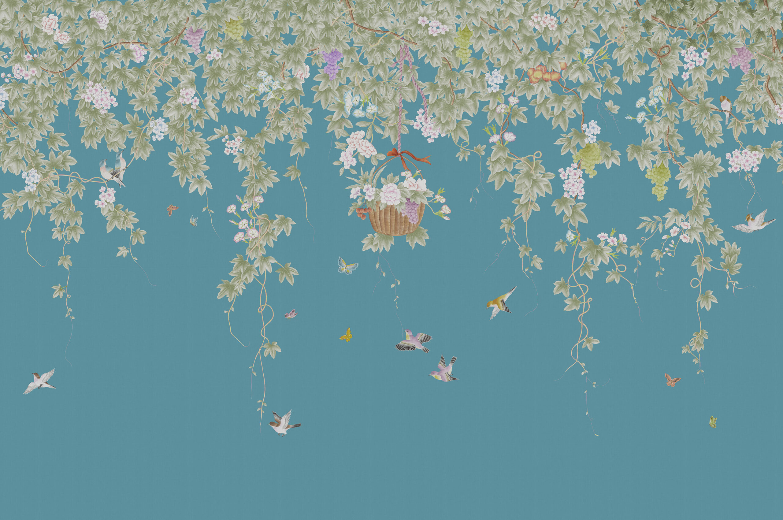 This scene near the ancient city of Lijiang Old Town features a passageway with grape vines hanging above. It was a favourite pastime to walk under such vines in the quiet shade of a humble garden. The hanging vines are softly highlighted with flowers, butterflies and birds. A room decorated with this pattern provides a very unique look.