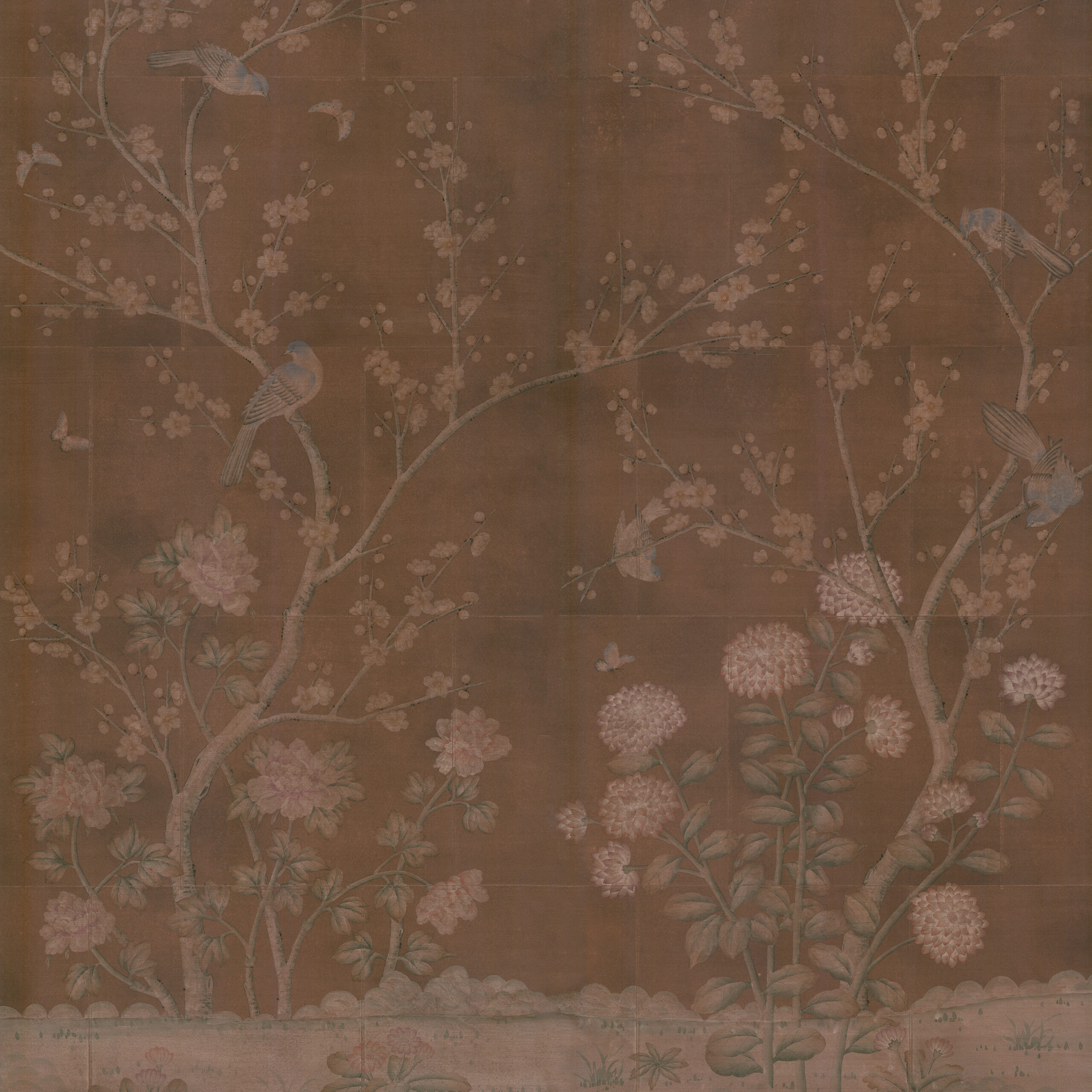 This wallpaper is a delightful representation of a spring Chinese garden in the former trading route of Hunza Valley. Delicately hand painted plum blossom forms a backdrop for the bold camellias and Chinese chrysanthemums painted in the foreground.