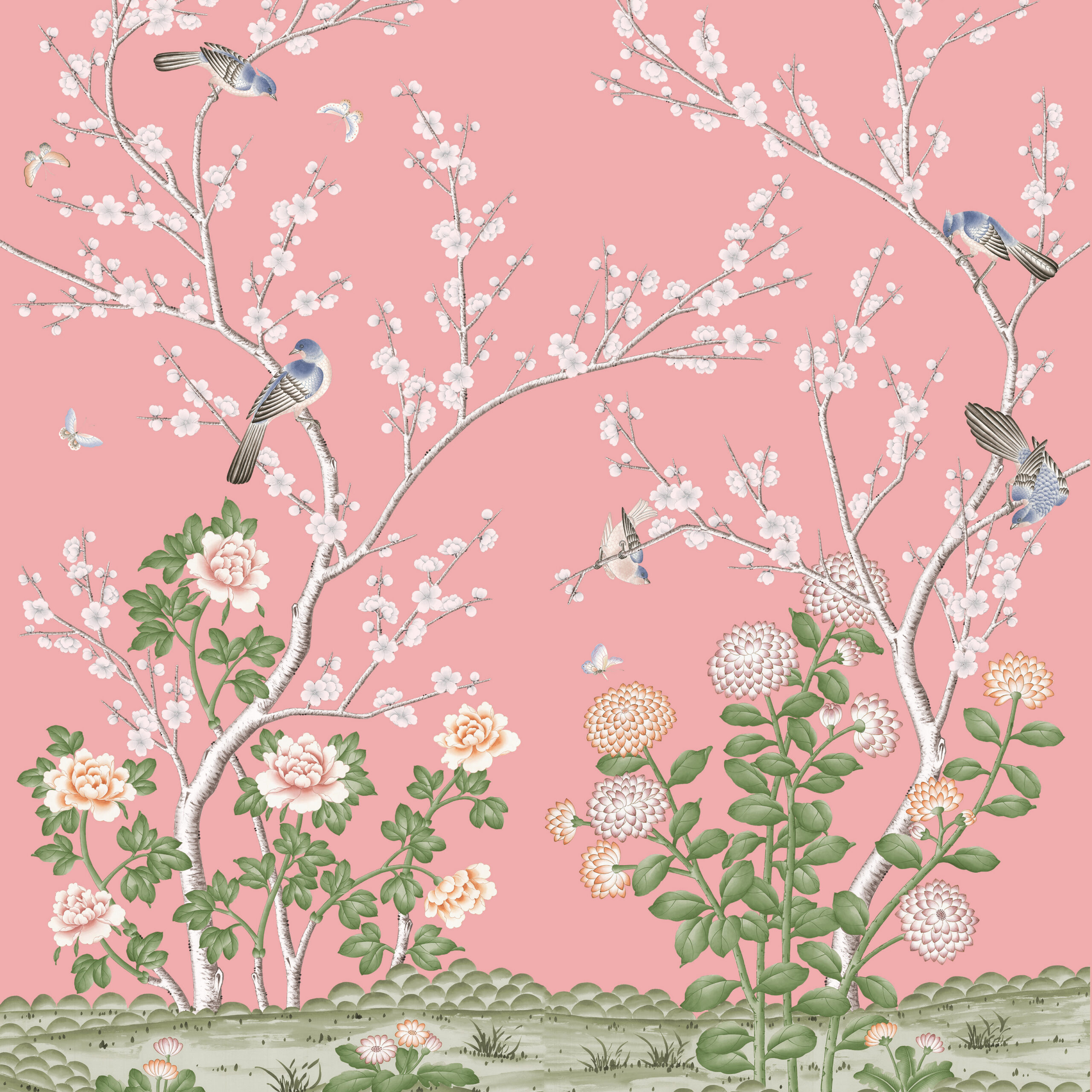 This wallpaper is a delightful representation of a spring Chinese garden in the former trading route of Hunza Valley. Delicately hand painted plum blossom forms a backdrop for the bold camellias and Chinese chrysanthemums painted in the foreground.