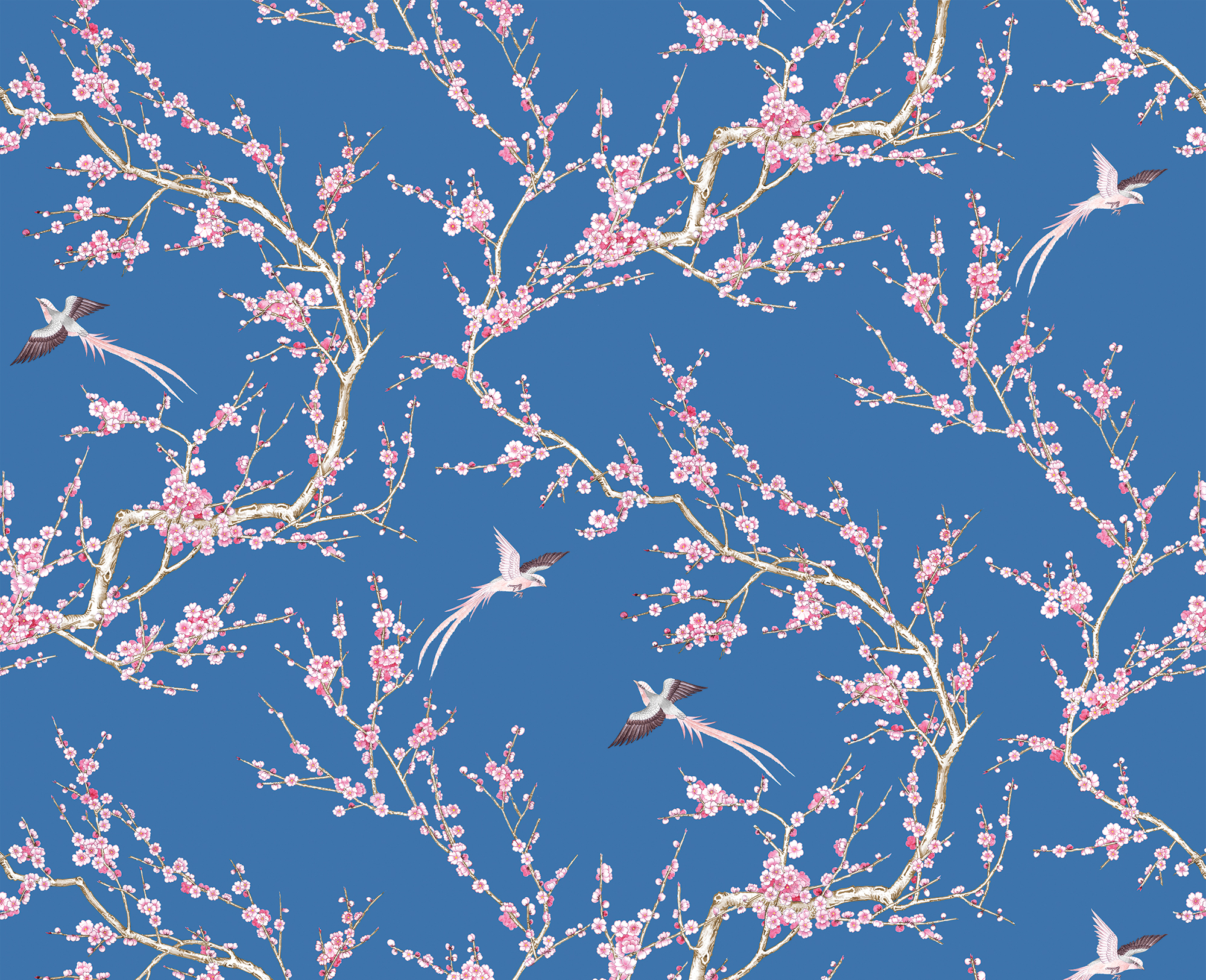 A contemporary rendition of the classic plum blossom with flying golden pheasants. The plum blossom signifies resilience and perseverance as it blooms in the harshest of winters, and the pheasant represents beauty and good fortune. The composition and detail create a stunning design worthy of the name Keukenhof, the garden of Europe, one of the world’s largest flower gardens.