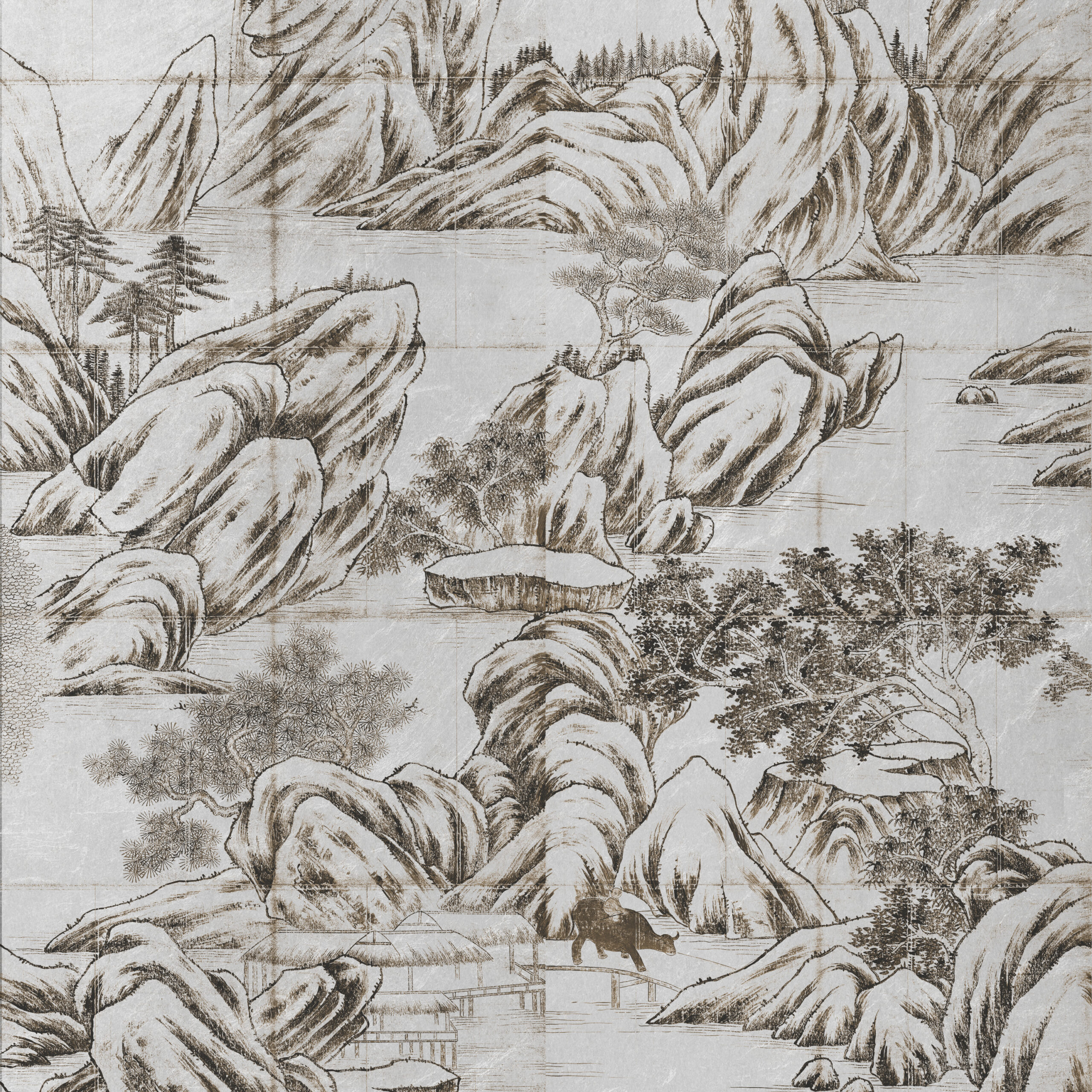 Tags: Chinoiseries, Hand Painted, Landscape, Mural, Pieced and Glued Metallic, Silver, Traditional
