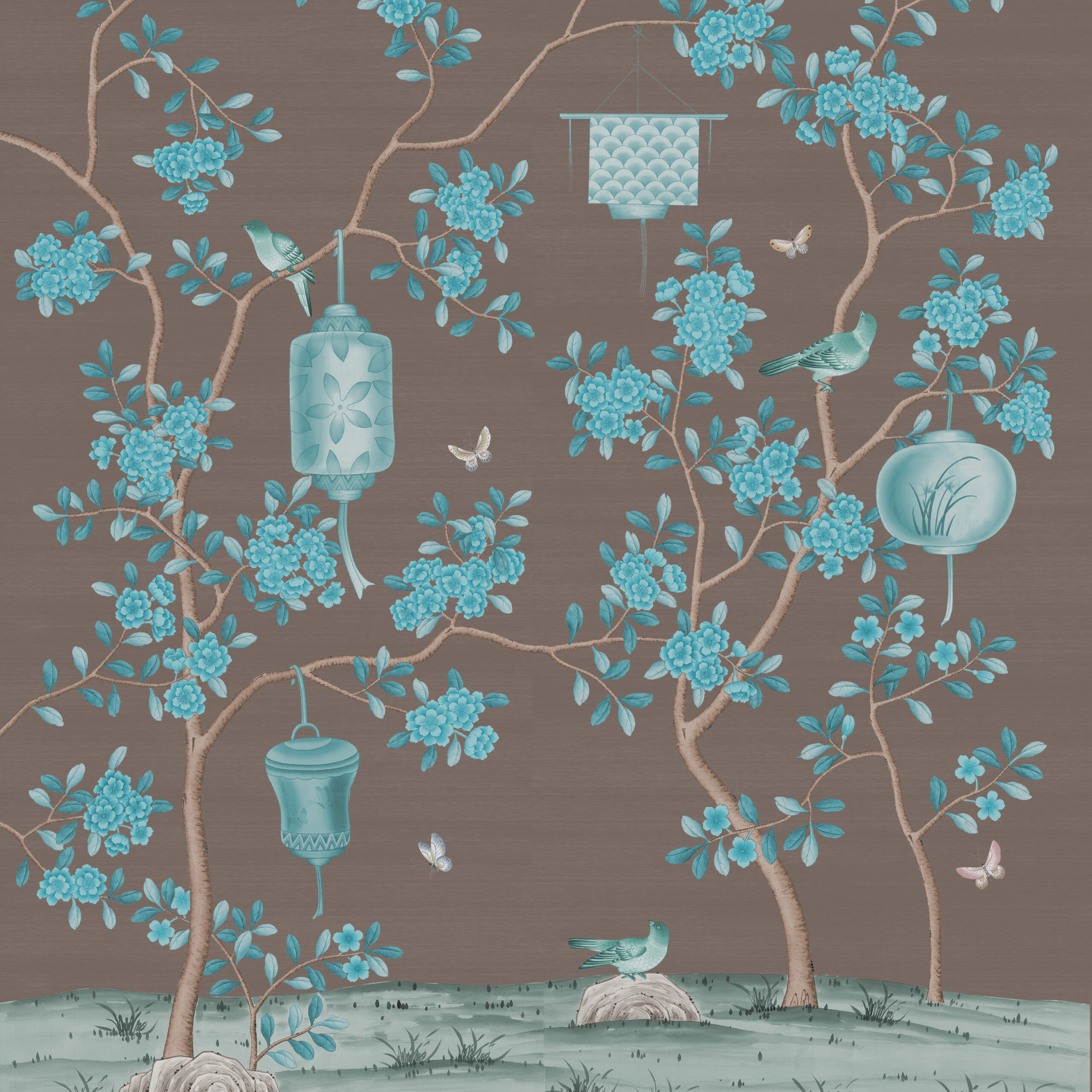 Our delicate Lanterns scene captures the traditional activity of hanging lanterns in trees. Contemporary in style, our hand painting celebrates this activity with delicately drawn lanterns in many shapes and sizes together with birds and butterflies.