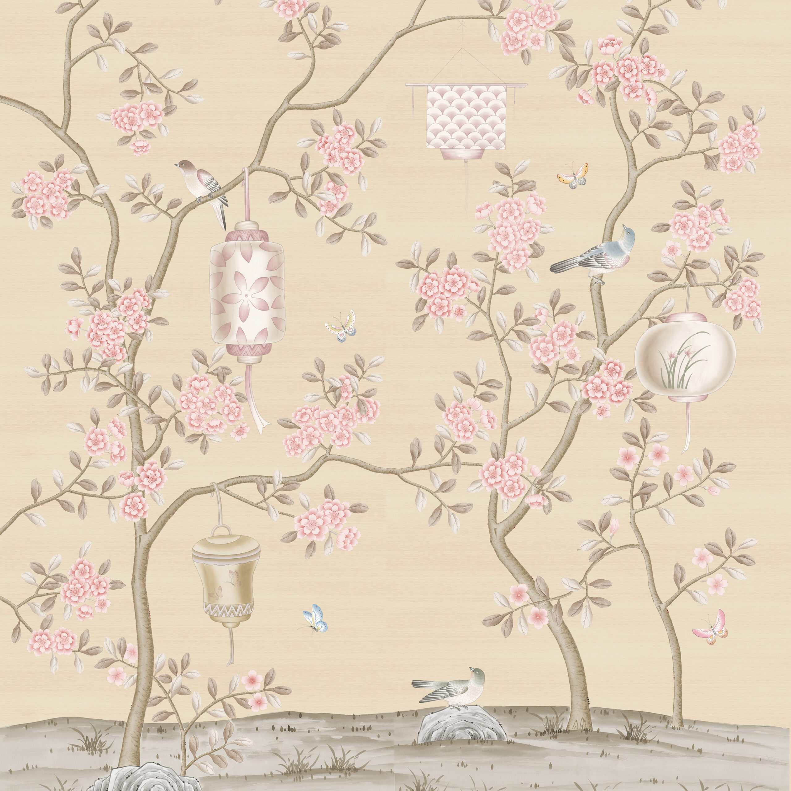 Our delicate Lanterns scene captures the traditional activity of hanging lanterns in trees. Contemporary in style, our hand painting celebrates this activity with delicately drawn lanterns in many shapes and sizes together with birds and butterflies.
