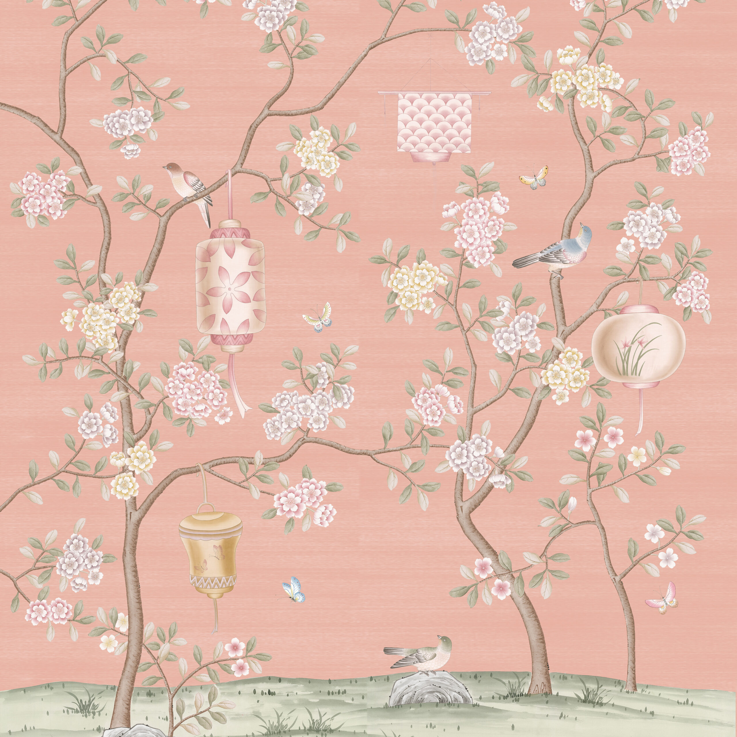 Our delicate Lanterns scene captures the traditional activity of hanging lanterns in trees. Contemporary in style, our hand painting celebrates this activity with delicately drawn lanterns in many shapes and sizes together with birds and butterflies.