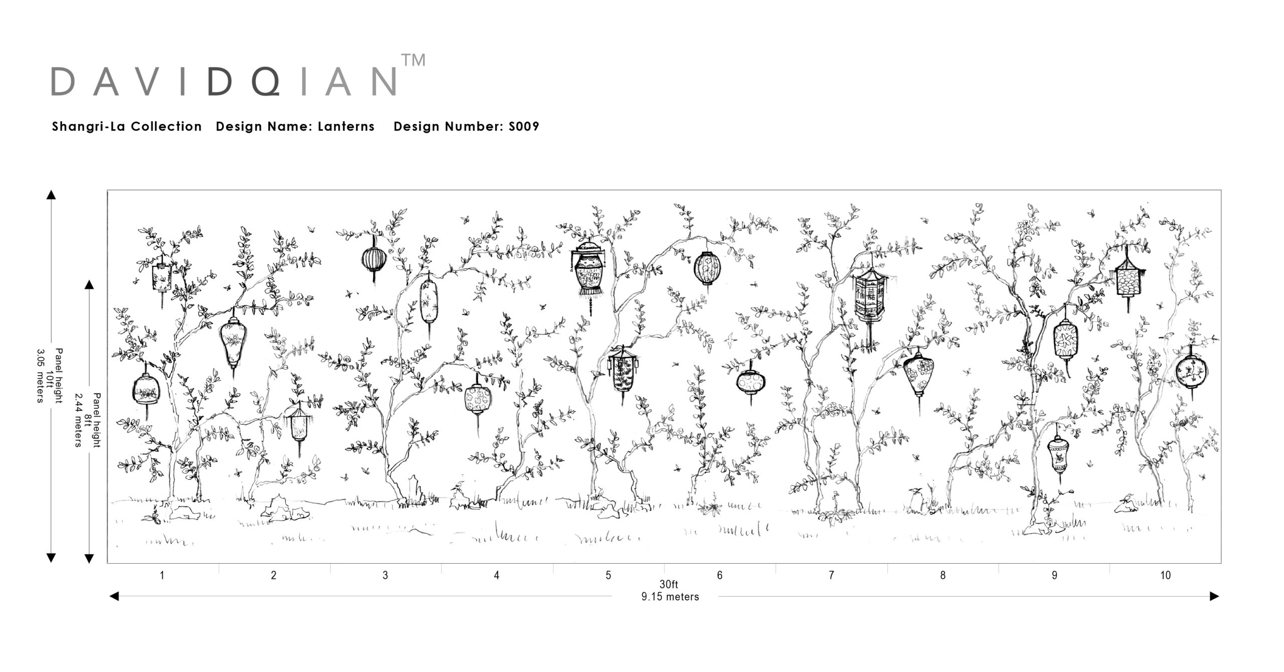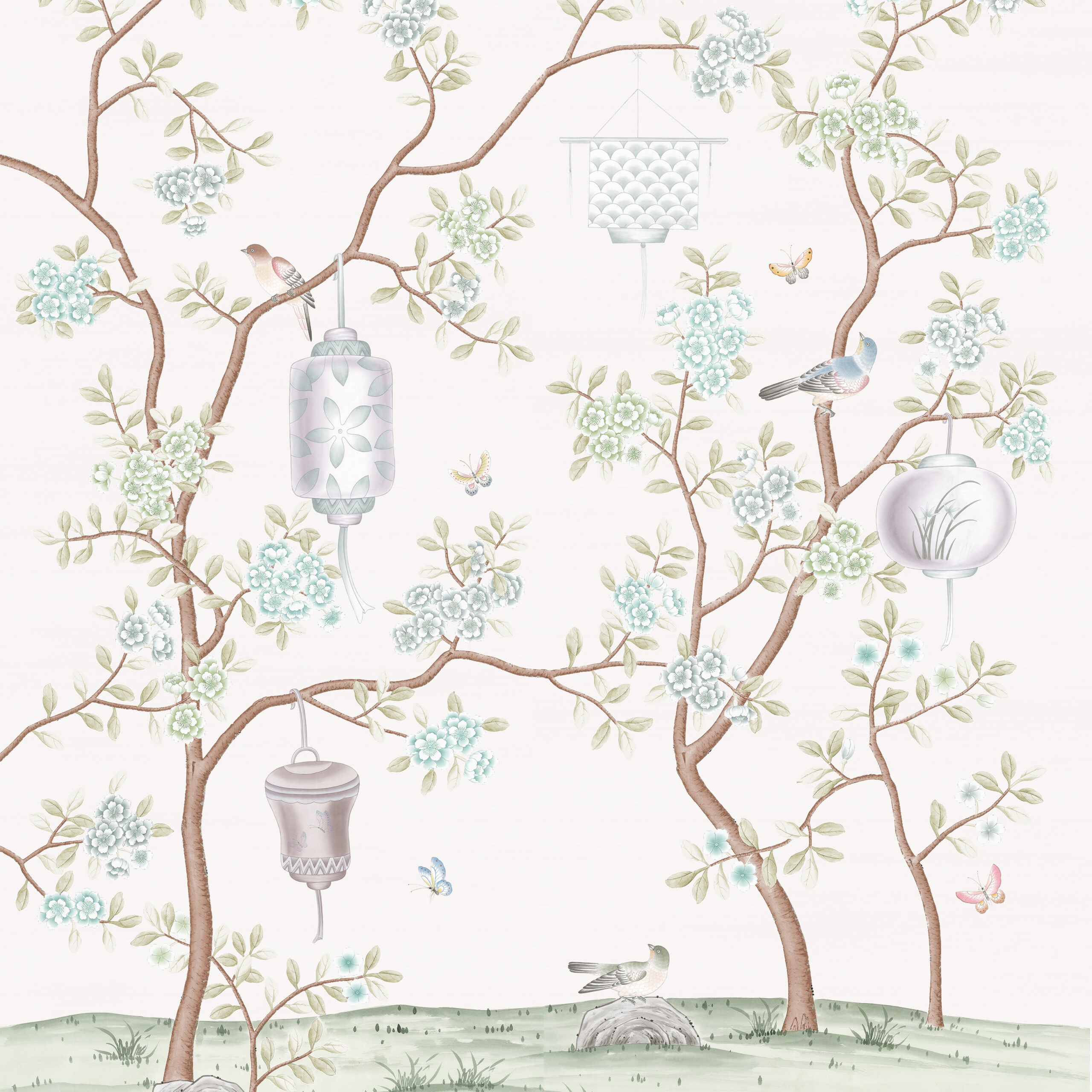 Our delicate Lanterns scene captures the traditional activity of hanging lanterns in trees. Contemporary in style, our hand painting celebrates this activity with delicately drawn lanterns in many shapes and sizes together with birds and butterflies.