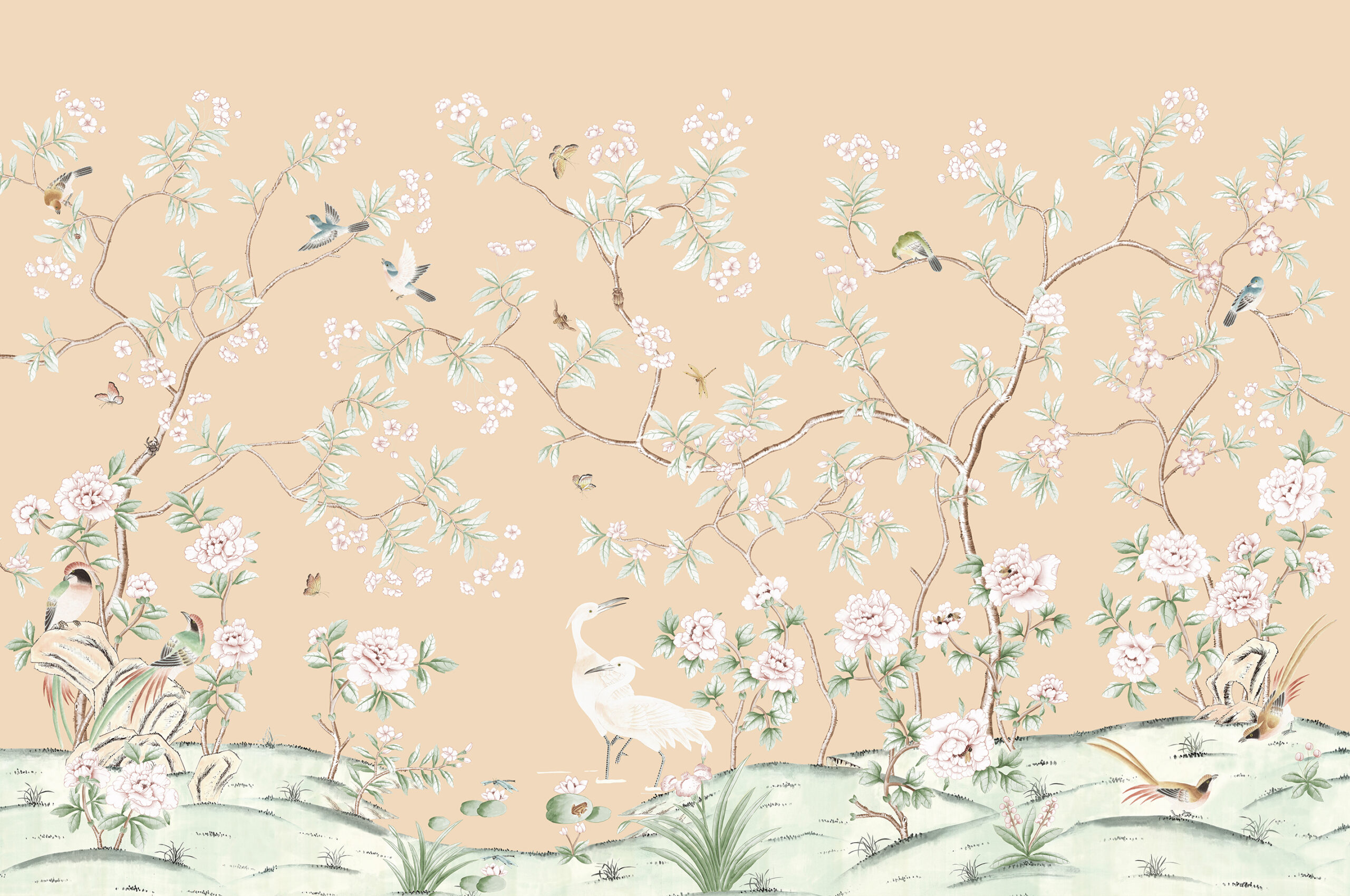 A delightful representation of a Chinese garden in Spring. Two golden pheasants look across the tranquil scene towards a pair of sarus cranes. Butterflies dance around the garden which contains the perfect mixture of fine layered detail and open space. The design is really beautiful in a lively, bold or natural colour palette, on a silk or gilded metallic.