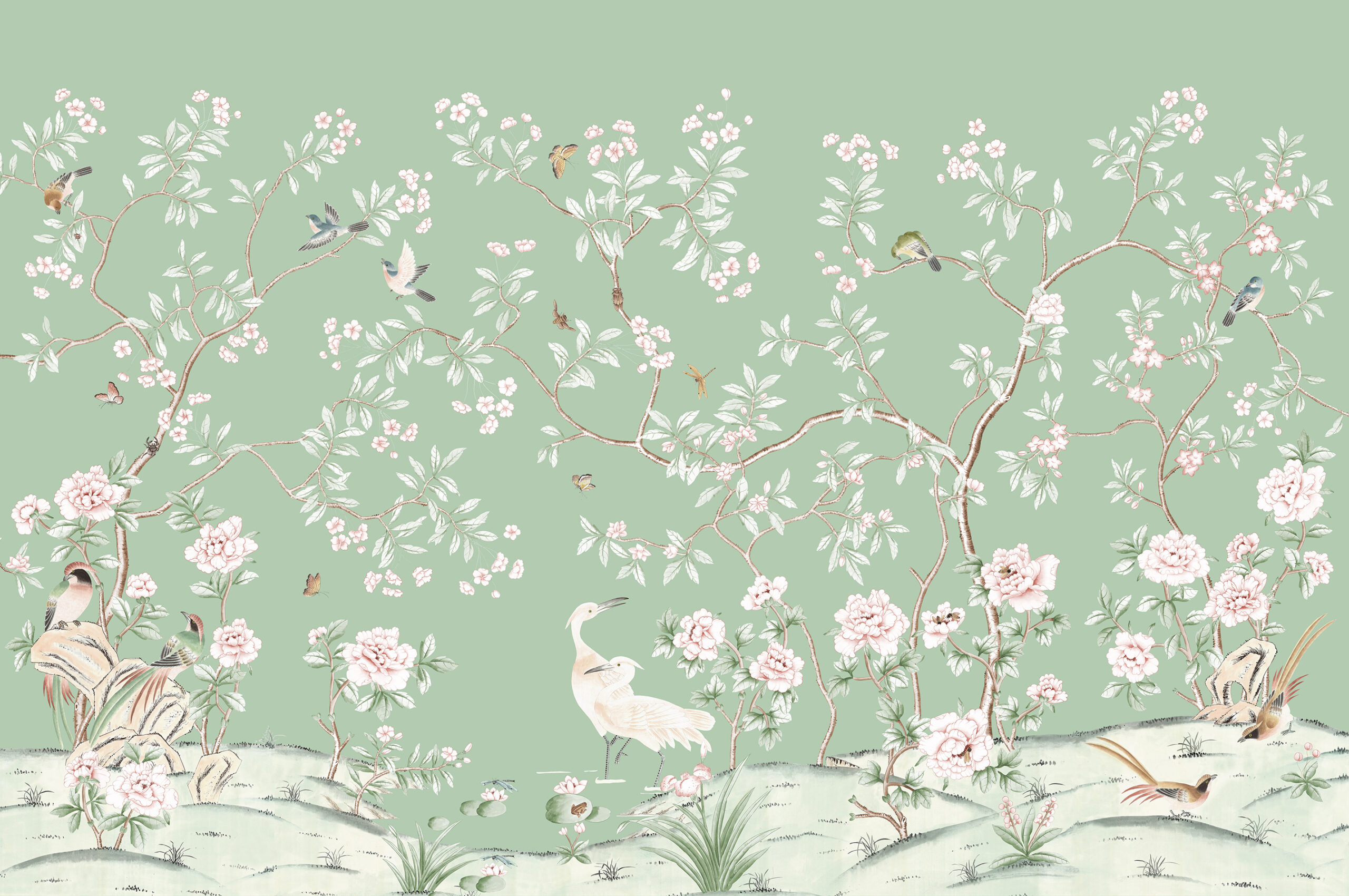 A delightful representation of a Chinese garden in Spring. Two golden pheasants look across the tranquil scene towards a pair of sarus cranes. Butterflies dance around the garden which contains the perfect mixture of fine layered detail and open space. The design is really beautiful in a lively, bold or natural colour palette, on a silk or gilded metallic.
