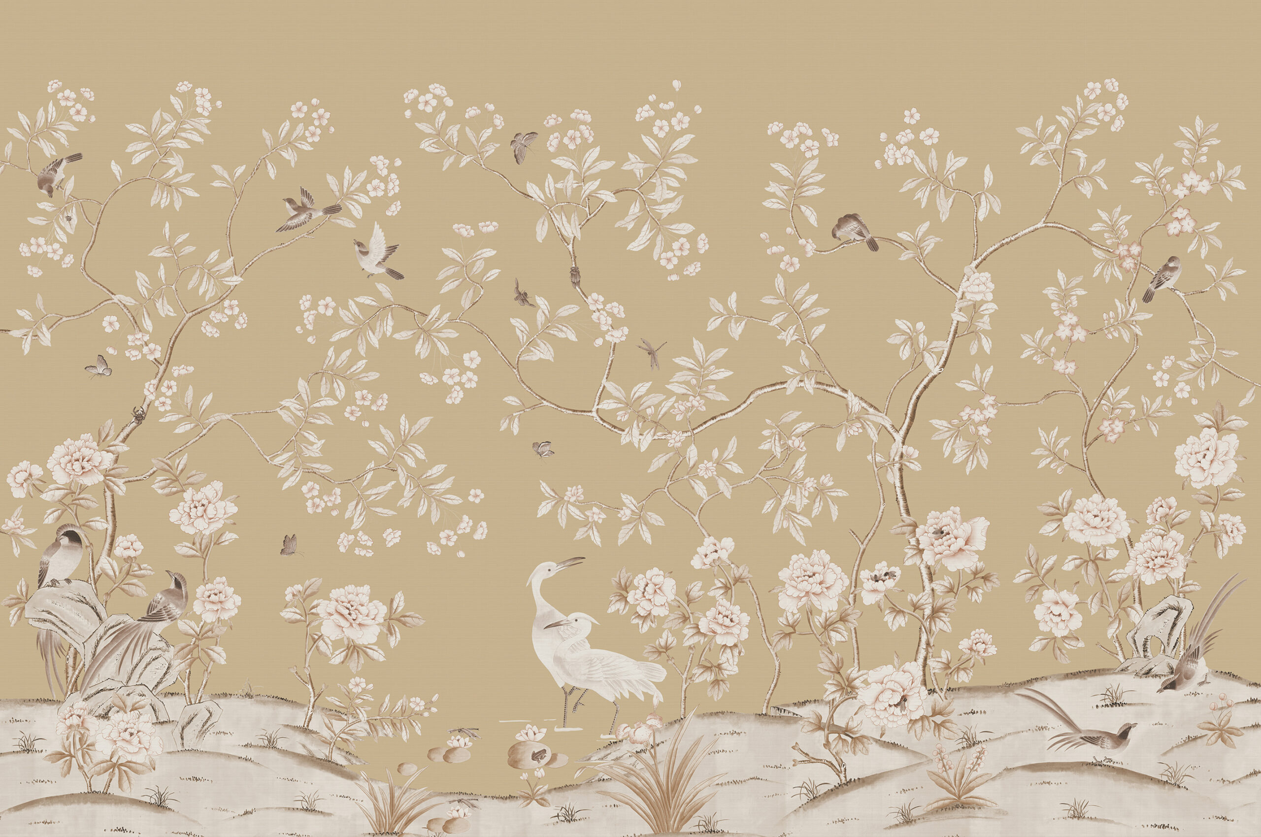 A delightful representation of a Chinese garden in Spring. Two golden pheasants look across the tranquil scene towards a pair of sarus cranes. Butterflies dance around the garden which contains the perfect mixture of fine layered detail and open space. The design is really beautiful in a lively, bold or natural colour palette, on a silk or gilded metallic.
