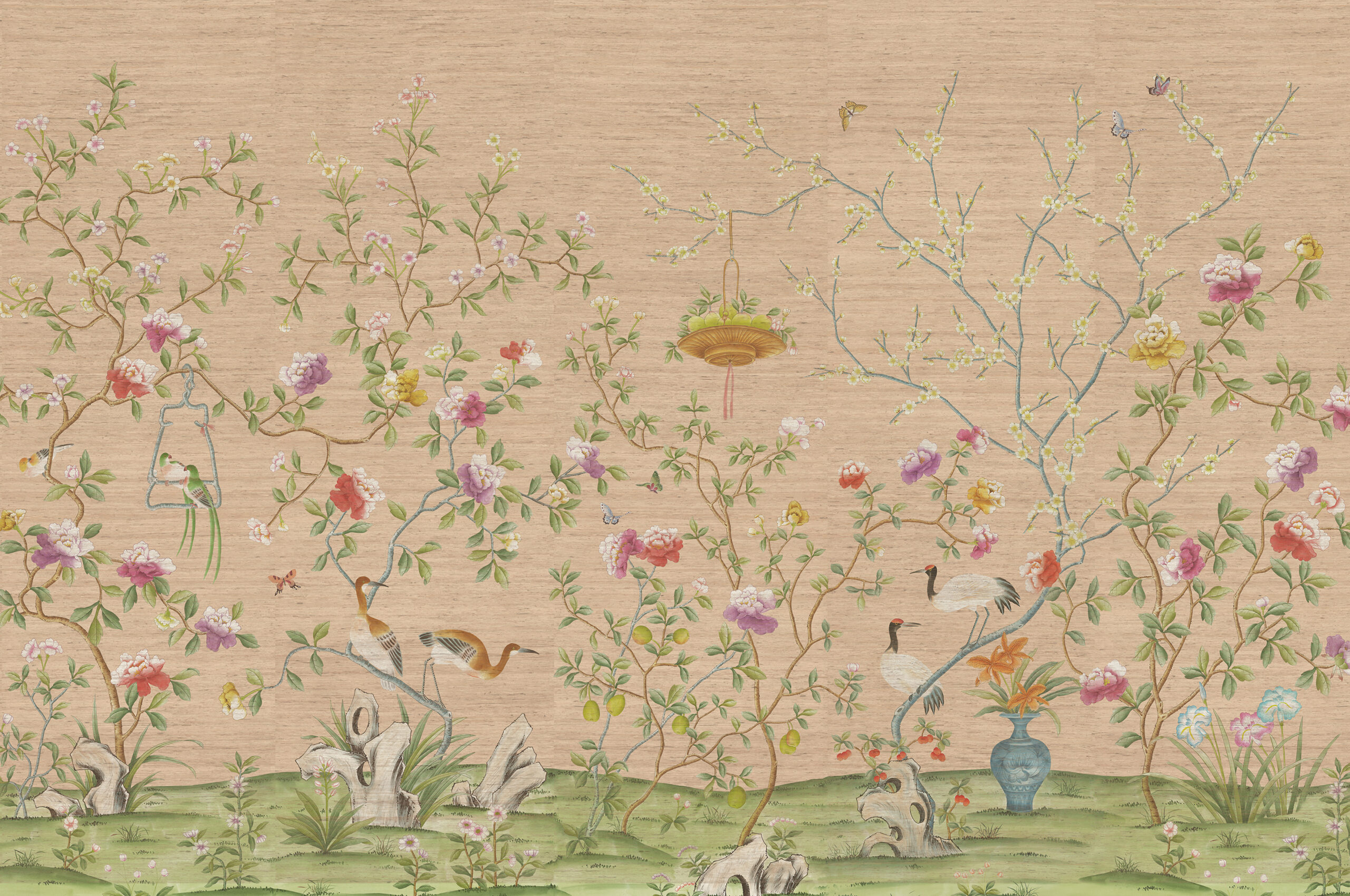 A delicately painted lively scene this exotic garden in Hunan Province depicts decorative artefacts of the period. Birds can be admired perched in trees and on delicate ornate frames. A pair of sarus cranes decorate an ornate branch and butterflies dance from flower to flower. This design works well in muted natural and pastel shades for a delicate look, as well as using stronger bolder colours to create a statement. Printing on arrowroot with metallic adds extra lustre and a touch of sparkle to the scene.