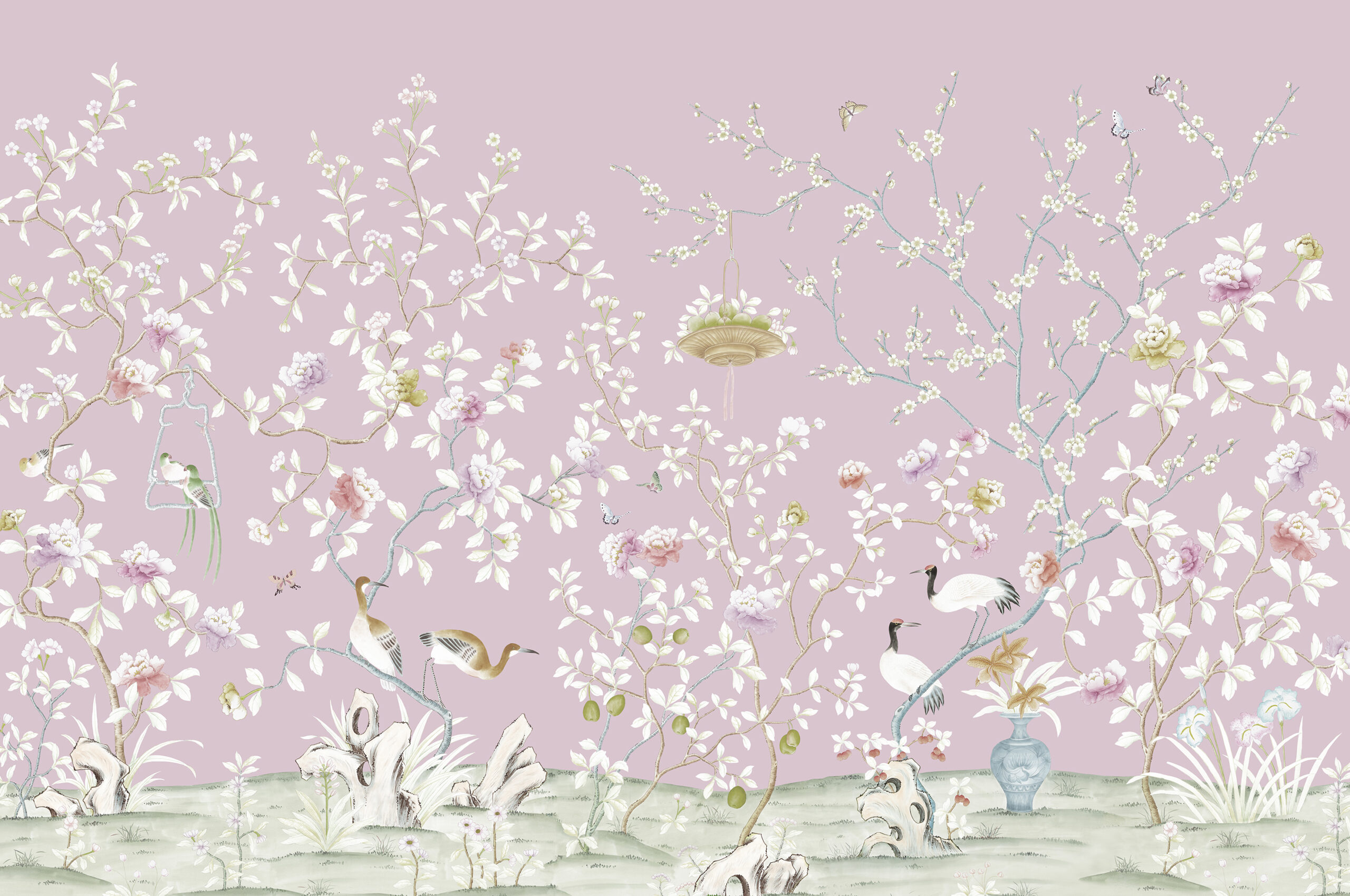 A delicately painted lively scene this exotic garden in Hunan Province depicts decorative artefacts of the period. Birds can be admired perched in trees and on delicate ornate frames. A pair of sarus cranes decorate an ornate branch and butterflies dance from flower to flower. This design works well in muted natural and pastel shades for a delicate look, as well as using stronger bolder colours to create a statement. Printing on arrowroot with metallic adds extra lustre and a touch of sparkle to the scene.