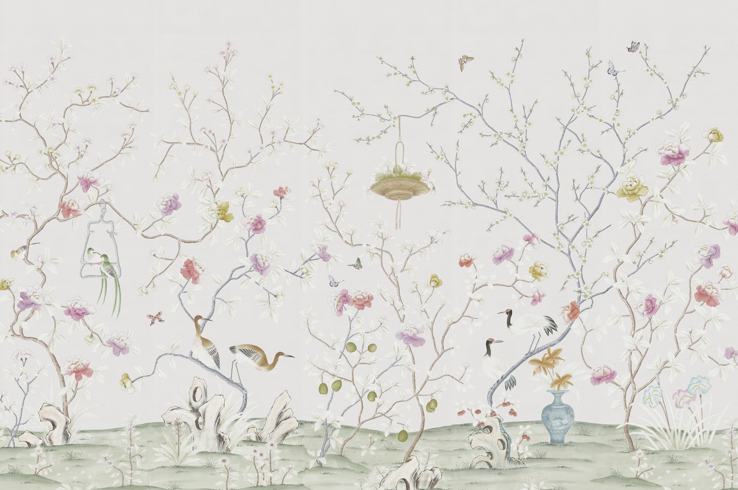 A delicately painted lively scene this exotic garden in Hunan Province depicts decorative artefacts of the period. Birds can be admired perched in trees and on delicate ornate frames. A pair of sarus cranes decorate an ornate branch and butterflies dance from flower to flower. This design works well in muted natural and pastel shades for a delicate look, as well as using stronger bolder colours to create a statement. Printing on arrowroot with metallic adds extra lustre and a touch of sparkle to the scene.